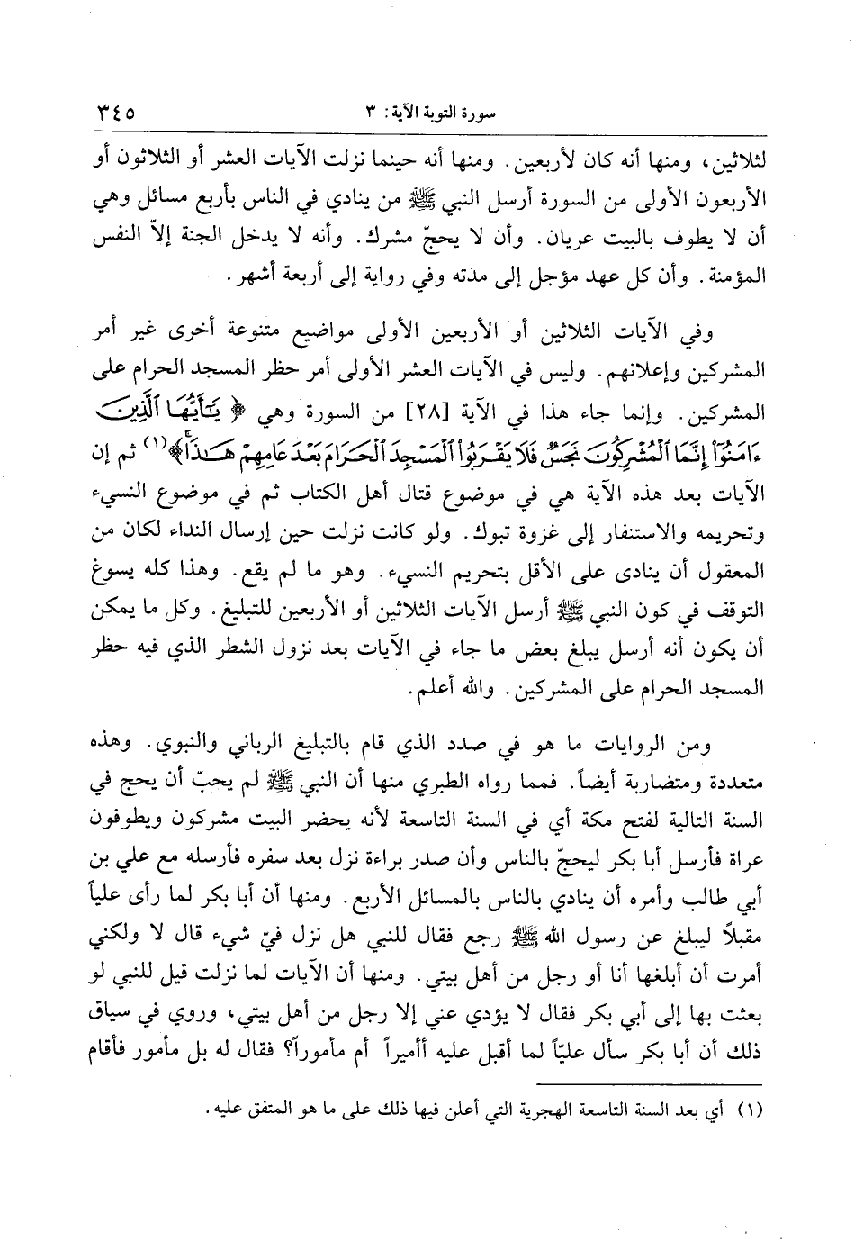 وفي الآيات الثلاثين أو الأربعين الأولى مواضيع متنوعة أخرى غير أمر المشركين وإعلانهم. وليس في الآيات العشر الأولى أمر حظر المسجد الحرام على المشركين. وإنما جاء هذا في الآية [28] من السورة وهي يا أَيُّهَا الَّذِينَ آمَنُوا إِنَّمَا الْمُشْرِكُونَ نَجَسٌ فَلا يَقْرَبُوا الْمَسْجِدَ الْحَرامَ بَعْدَ عامِهِمْ هذا «1» ثم إن الآيات بعد هذه الآية هي في موضوع قتال أهل الكتاب ثم في موضوع النسيء وتحريمه والاستنفار إلى غزوة تبوك. ولو كانت نزلت حين إرسال النداء لكان من المعقول أن ينادى على الأقل بتحريم النسيء. وهو ما لم يقع. وهذا كله يسوغ التوقف في كون النبي صلى الله عليه وسلم أرسل الآيات الثلاثين أو الأربعين للتبليغ. وكل ما يمكن أن يكون أنه أرسل يبلغ بعض ما جاء في الآيات بعد نزول الشطر الذي فيه حظر المسجد الحرام على المشركين. والله أعلم.
