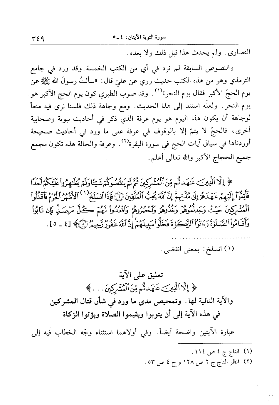 والنصوص السابقة لم ترد في أي من الكتب الخمسة. وقد ورد في جامع الترمذي وهو من هذه الكتب حديث روي عن عليّ قال: «سألت رسول الله صلى الله عليه وسلم عن يوم الحجّ الأكبر فقال يوم النحر» «1» . وقد صوب الطبري كون يوم الحج الأكبر هو يوم النحر. ولعلّه استند إلى هذا الحديث. ومع وجاهة ذلك فلسنا نرى فيه منعا لوجاهة أن يكون هذا اليوم هو يوم عرفة الذي ذكر في أحاديث نبوية وصحابية أخرى، فالحجّ لا يتمّ إلا بالوقوف في عرفة على ما ورد في أحاديث صحيحة أوردناها في سياق آيات الحج في سورة البقرة «2» . وعرفة والحالة هذه تكون مجمع جميع الحجاج الأكبر والله تعالى أعلم.