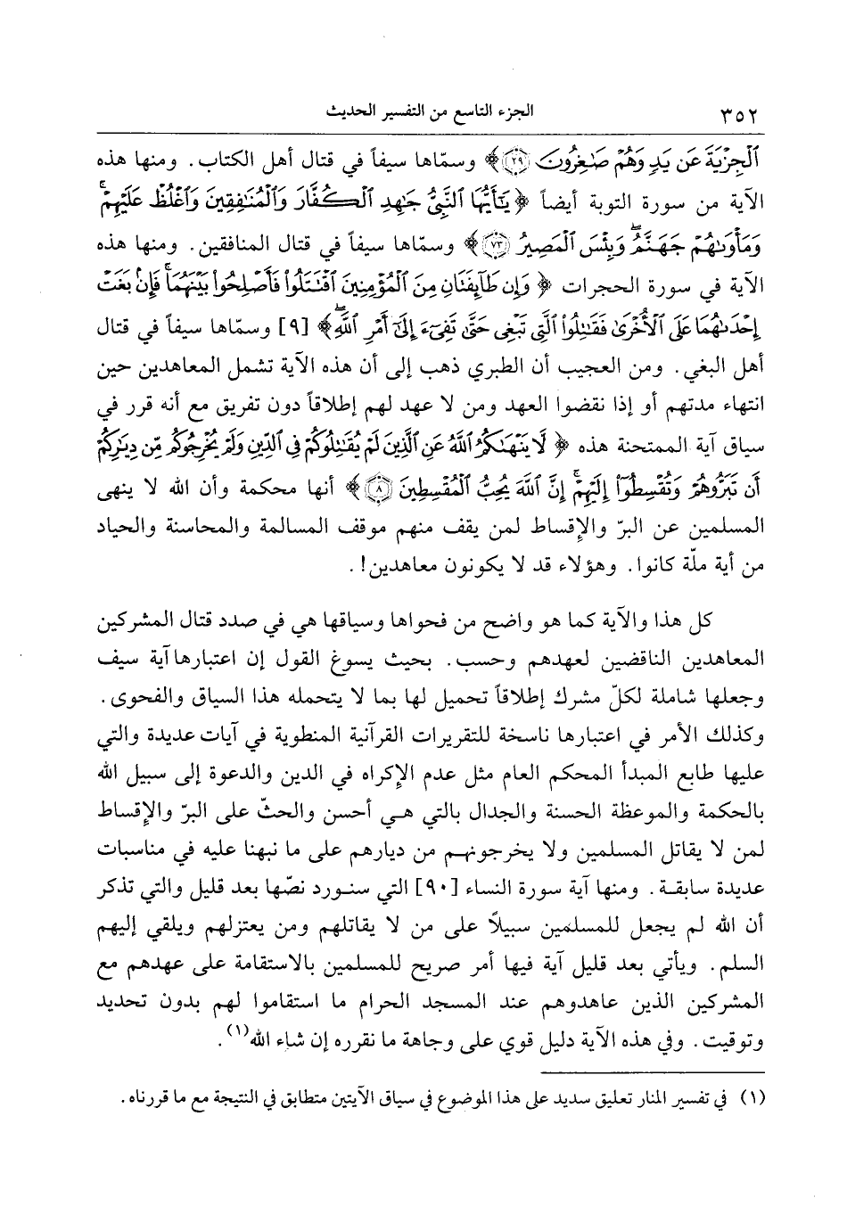 (29) وسمّاها سيفا في قتال أهل الكتاب. ومنها هذه الآية من سورة التوبة أيضا يا أَيُّهَا النَّبِيُّ جاهِدِ الْكُفَّارَ وَالْمُنافِقِينَ وَاغْلُظْ عَلَيْهِمْ وَمَأْواهُمْ جَهَنَّمُ وَبِئْسَ الْمَصِيرُ (73) وسمّاها سيفا في قتال المنافقين. ومنها هذه الآية في سورة الحجرات وَإِنْ طائِفَتانِ مِنَ الْمُؤْمِنِينَ اقْتَتَلُوا فَأَصْلِحُوا بَيْنَهُما فَإِنْ بَغَتْ إِحْداهُما عَلَى الْأُخْرى فَقاتِلُوا الَّتِي تَبْغِي حَتَّى تَفِيءَ إِلى أَمْرِ اللَّهِ [9] وسمّاها سيفا في قتال أهل البغي. ومن العجيب أن الطبري ذهب إلى أن هذه الآية تشمل المعاهدين حين انتهاء مدتهم أو إذا نقضوا العهد ومن لا عهد لهم إطلاقا دون تفريق مع أنه قرر في سياق آية الممتحنة هذه لا يَنْهاكُمُ اللَّهُ عَنِ الَّذِينَ لَمْ يُقاتِلُوكُمْ فِي الدِّينِ وَلَمْ يُخْرِجُوكُمْ مِنْ دِيارِكُمْ أَنْ تَبَرُّوهُمْ وَتُقْسِطُوا إِلَيْهِمْ إِنَّ اللَّهَ يُحِبُّ الْمُقْسِطِينَ (8) أنها محكمة وأن الله لا ينهى المسلمين عن البرّ والإقساط لمن يقف منهم موقف المسالمة والمحاسنة والحياد من أية ملّة كانوا. وهؤلاء قد لا يكونون معاهدين!.
