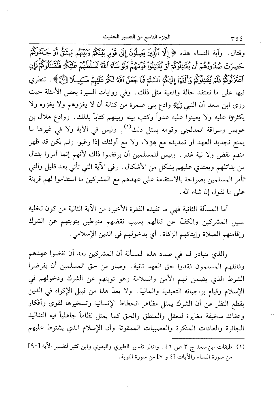 وقتال. وآية النساء هذه إِلَّا الَّذِينَ يَصِلُونَ إِلى قَوْمٍ بَيْنَكُمْ وَبَيْنَهُمْ مِيثاقٌ أَوْ جاؤُكُمْ حَصِرَتْ صُدُورُهُمْ أَنْ يُقاتِلُوكُمْ أَوْ يُقاتِلُوا قَوْمَهُمْ وَلَوْ شاءَ اللَّهُ لَسَلَّطَهُمْ عَلَيْكُمْ فَلَقاتَلُوكُمْ فَإِنِ اعْتَزَلُوكُمْ فَلَمْ يُقاتِلُوكُمْ وَأَلْقَوْا إِلَيْكُمُ السَّلَمَ فَما جَعَلَ اللَّهُ لَكُمْ عَلَيْهِمْ سَبِيلًا (90) . تنطوي فيها على ما نعتقد حالة واقعية مثل ذلك. وفي روايات السيرة بعض الأمثلة حيث روى ابن سعد أن النبي صلى الله عليه وسلم وادع بني ضمرة من كنانة أن لا يغزوهم ولا يغزوه ولا يكثروا عليه ولا يعينوا عليه عدوا وكتب بينه وبينهم كتابا بذلك. ووادع هلال بن عويمر وسراقة المدلجي وقومه بمثل ذلك «1» . وليس في الآية ولا في غيرها ما يمنع تجديد العهد أو تمديده مع هؤلاء ولا مع أولئك إذا رغبوا ولم يكن قد ظهر منهم نقض ولا نية غدر. وليس للمسلمين أن يرفضوا ذلك لأنهم إنما أمروا بقتال من يقاتلهم ويعتدي عليهم بشكل من الأشكال. وفي الآية التي تأتي بعد قليل والتي تأمر المسلمين بصراحة بالاستقامة على عهدهم مع المشركين ما استقاموا لهم قرينة على ما نقول إن شاء الله.