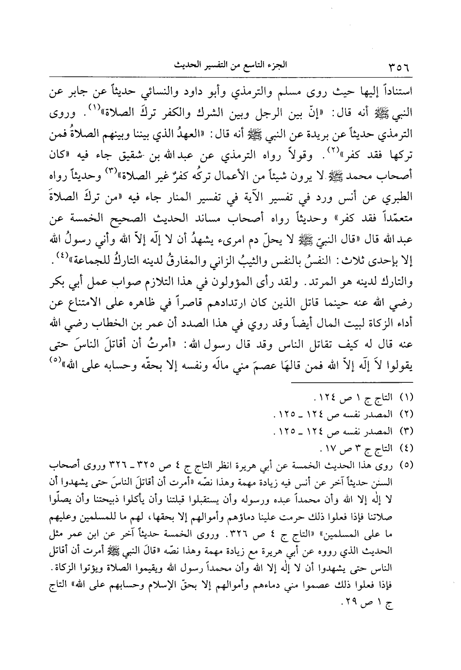 (5) روى هذا الحديث الخمسة عن أبي هريرة انظر التاج ج 4 ص 325- 326 وروى أصحاب السنن حديثا آخر عن أنس فيه زيادة مهمة وهذا نصّه «أمرت أن أقاتل الناس حتى يشهدوا أن لا إله إلا الله وأن محمدا عبده ورسوله وأن يستقبلوا قبلتنا وأن يأكلوا ذبيحتنا وأن يصلّوا صلاتنا فإذا فعلوا ذلك حرمت علينا دماؤهم وأموالهم إلا بحقها، لهم ما للمسلمين وعليهم ما على المسلمين» «التاج ج 4 ص 326. وروى الخمسة حديثا آخر عن ابن عمر مثل الحديث الذي رووه عن أبي هريرة مع زيادة مهمة وهذا نصّه «قال النبي صلى الله عليه وسلم أمرت أن أقاتل الناس حتى يشهدوا أن لا إله إلا الله وأن محمدا رسول الله ويقيموا الصلاة ويؤتوا الزكاة.