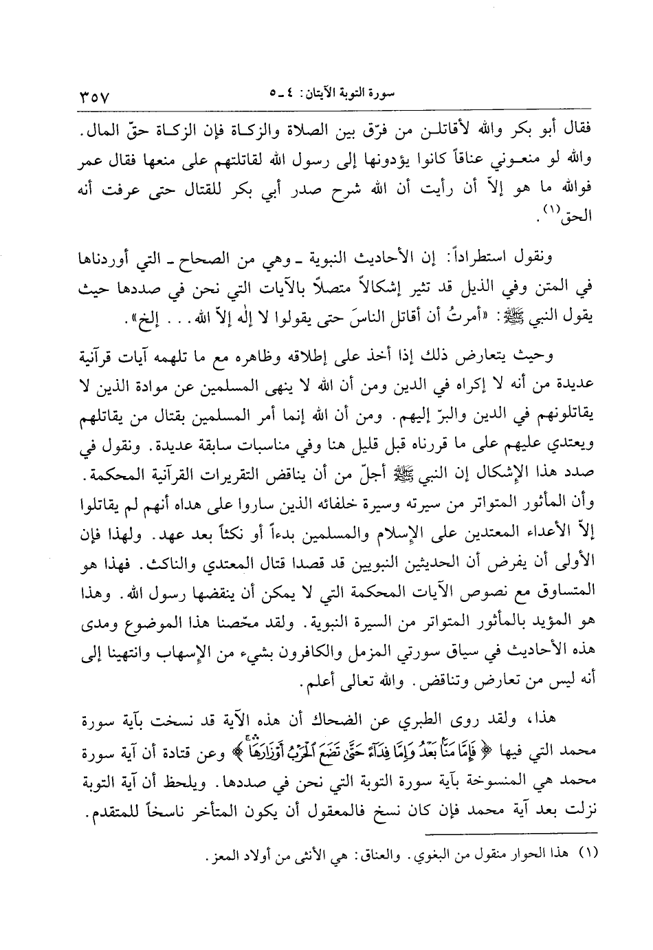 وحيث يتعارض ذلك إذا أخذ على إطلاقه وظاهره مع ما تلهمه آيات قرآنية عديدة من أنه لا إكراه في الدين ومن أن الله لا ينهى المسلمين عن موادة الذين لا يقاتلونهم في الدين والبرّ إليهم. ومن أن الله إنما أمر المسلمين بقتال من يقاتلهم ويعتدي عليهم على ما قررناه قبل قليل هنا وفي مناسبات سابقة عديدة. ونقول في صدد هذا الإشكال إن النبي صلى الله عليه وسلم أجلّ من أن يناقض التقريرات القرآنية المحكمة.