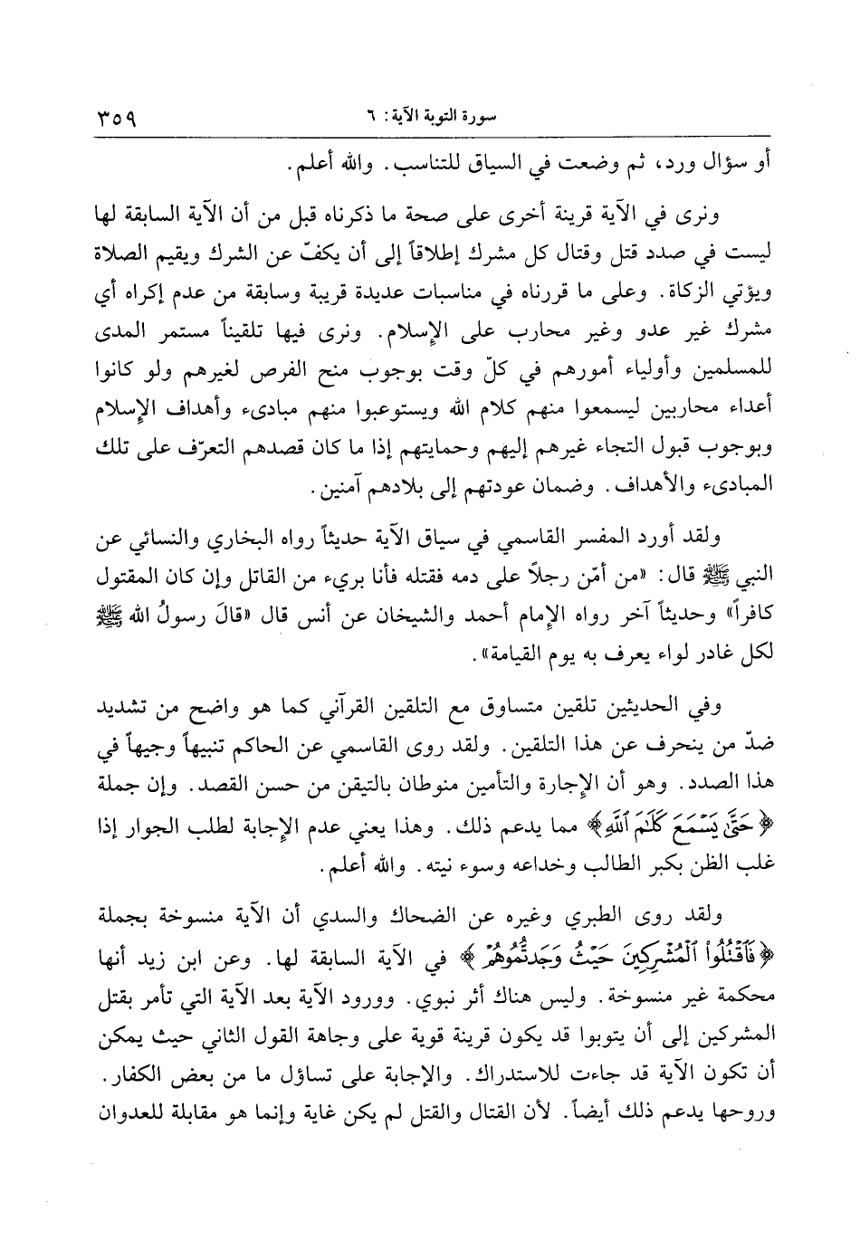 وفي الحديثين تلقين متساوق مع التلقين القرآني كما هو واضح من تشديد ضدّ من ينحرف عن هذا التلقين. ولقد روى القاسمي عن الحاكم تنبيها وجيها في هذا الصدد. وهو أن الإجارة والتأمين منوطان بالتيقن من حسن القصد. وإن جملة حَتَّى يَسْمَعَ كَلامَ اللَّهِ مما يدعم ذلك. وهذا يعني عدم الإجابة لطلب الجوار إذا غلب الظن بكبر الطالب وخداعه وسوء نيته. والله أعلم.