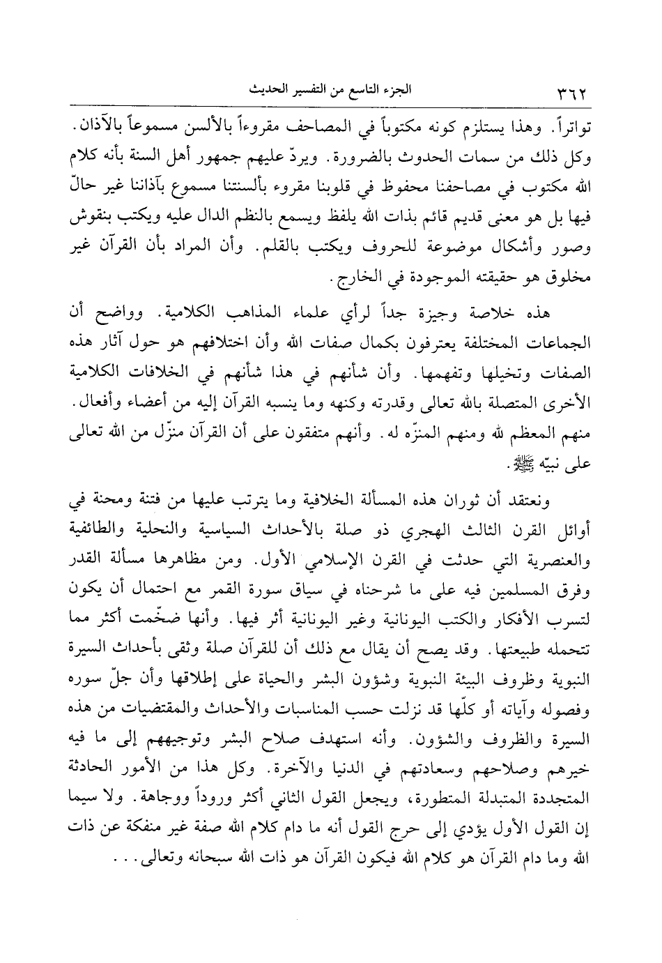 ونعتقد أن ثوران هذه المسألة الخلافية وما يترتب عليها من فتنة ومحنة في أوائل القرن الثالث الهجري ذو صلة بالأحداث السياسية والنحلية والطائفية والعنصرية التي حدثت في القرن الإسلامي الأول. ومن مظاهرها مسألة القدر وفرق المسلمين فيه على ما شرحناه في سياق سورة القمر مع احتمال أن يكون لتسرب الأفكار والكتب اليونانية وغير اليونانية أثر فيها. وأنها ضخّمت أكثر مما تتحمله طبيعتها. وقد يصح أن يقال مع ذلك أن للقرآن صلة وثقى بأحداث السيرة النبوية وظروف البيئة النبوية وشؤون البشر والحياة على إطلاقها وأن جلّ سوره وفصوله وآياته أو كلّها قد نزلت حسب المناسبات والأحداث والمقتضيات من هذه السيرة والظروف والشؤون. وأنه استهدف صلاح البشر وتوجيههم إلى ما فيه خيرهم وصلاحهم وسعادتهم في الدنيا والآخرة. وكل هذا من الأمور الحادثة المتجددة المتبدلة المتطورة، ويجعل القول الثاني أكثر ورودا ووجاهة. ولا سيما إن القول الأول يؤدي إلى حرج القول أنه ما دام كلام الله صفة غير منفكة عن ذات الله وما دام القرآن هو كلام الله فيكون القرآن هو ذات الله سبحانه وتعالى ...