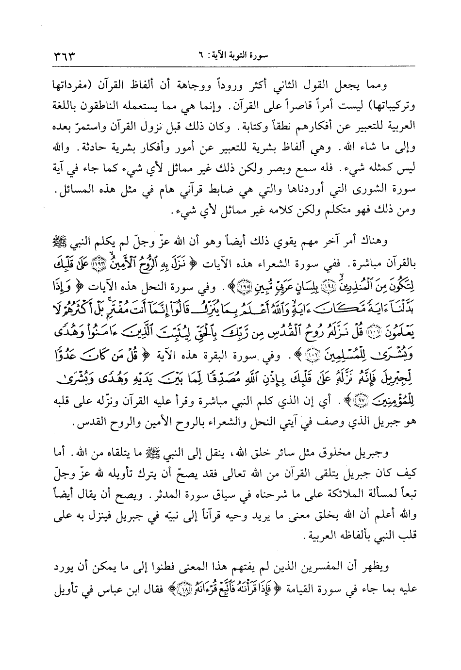 وهناك أمر آخر مهم يقوي ذلك أيضا وهو أن الله عزّ وجلّ لم يكلم النبي صلى الله عليه وسلم بالقرآن مباشرة. ففي سورة الشعراء هذه الآيات نَزَلَ بِهِ الرُّوحُ الْأَمِينُ (193) عَلى قَلْبِكَ لِتَكُونَ مِنَ الْمُنْذِرِينَ (194) بِلِسانٍ عَرَبِيٍّ مُبِينٍ (195) . وفي سورة النحل هذه الآيات وَإِذا بَدَّلْنا آيَةً مَكانَ آيَةٍ وَاللَّهُ أَعْلَمُ بِما يُنَزِّلُ قالُوا إِنَّما أَنْتَ مُفْتَرٍ بَلْ أَكْثَرُهُمْ لا يَعْلَمُونَ (101) قُلْ نَزَّلَهُ رُوحُ الْقُدُسِ مِنْ رَبِّكَ بِالْحَقِّ لِيُثَبِّتَ الَّذِينَ آمَنُوا وَهُدىً وَبُشْرى لِلْمُسْلِمِينَ (102) . وفي سورة البقرة هذه الآية قُلْ مَنْ كانَ عَدُوًّا لِجِبْرِيلَ فَإِنَّهُ نَزَّلَهُ عَلى قَلْبِكَ بِإِذْنِ اللَّهِ مُصَدِّقاً لِما بَيْنَ يَدَيْهِ وَهُدىً وَبُشْرى لِلْمُؤْمِنِينَ (97) . أي إن الذي كلم النبي مباشرة وقرأ عليه القرآن ونزّله على قلبه هو جبريل الذي وصف في آيتي النحل والشعراء بالروح الأمين والروح القدس.
