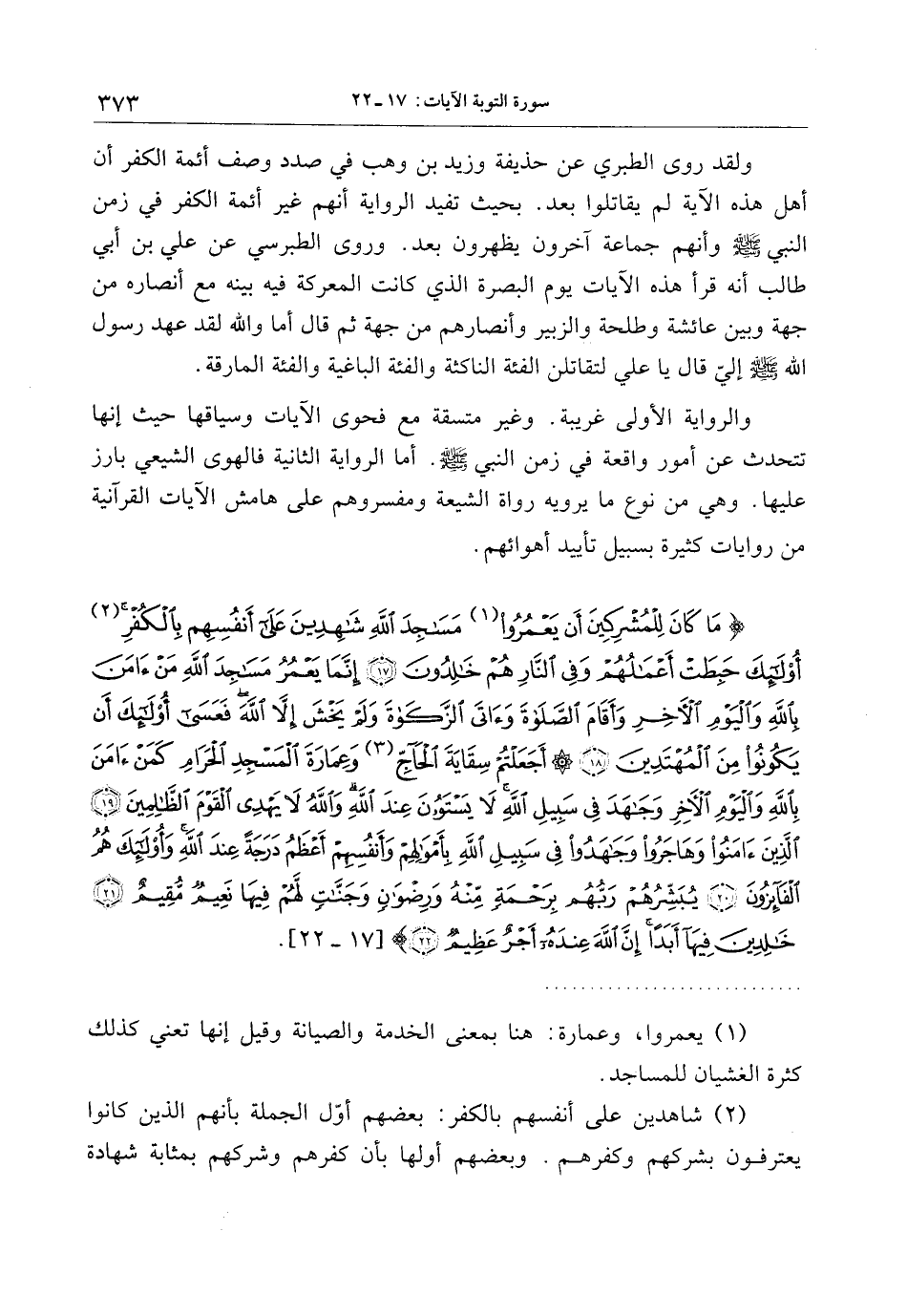 ما كانَ لِلْمُشْرِكِينَ أَنْ يَعْمُرُوا مَساجِدَ اللَّهِ شاهِدِينَ عَلى أَنْفُسِهِمْ بِالْكُفْرِ أُولئِكَ حَبِطَتْ أَعْمالُهُمْ وَفِي النَّارِ هُمْ خالِدُونَ (17) إِنَّما يَعْمُرُ مَساجِدَ اللَّهِ مَنْ آمَنَ بِاللَّهِ وَالْيَوْمِ الْآخِرِ وَأَقامَ الصَّلاةَ وَآتَى الزَّكاةَ وَلَمْ يَخْشَ إِلاَّ اللَّهَ فَعَسى أُولئِكَ أَنْ يَكُونُوا مِنَ الْمُهْتَدِينَ (18) أَجَعَلْتُمْ سِقايَةَ الْحاجِّ وَعِمارَةَ الْمَسْجِدِ الْحَرامِ كَمَنْ آمَنَ بِاللَّهِ وَالْيَوْمِ الْآخِرِ وَجاهَدَ فِي سَبِيلِ اللَّهِ لا يَسْتَوُونَ عِنْدَ اللَّهِ وَاللَّهُ لا يَهْدِي الْقَوْمَ الظَّالِمِينَ (19) الَّذِينَ آمَنُوا وَهاجَرُوا وَجاهَدُوا فِي سَبِيلِ اللَّهِ بِأَمْوالِهِمْ وَأَنْفُسِهِمْ أَعْظَمُ دَرَجَةً عِنْدَ اللَّهِ وَأُولئِكَ هُمُ الْفائِزُونَ (20) يُبَشِّرُهُمْ رَبُّهُمْ بِرَحْمَةٍ مِنْهُ وَرِضْوانٍ وَجَنَّاتٍ لَهُمْ فِيها نَعِيمٌ مُقِيمٌ (21)