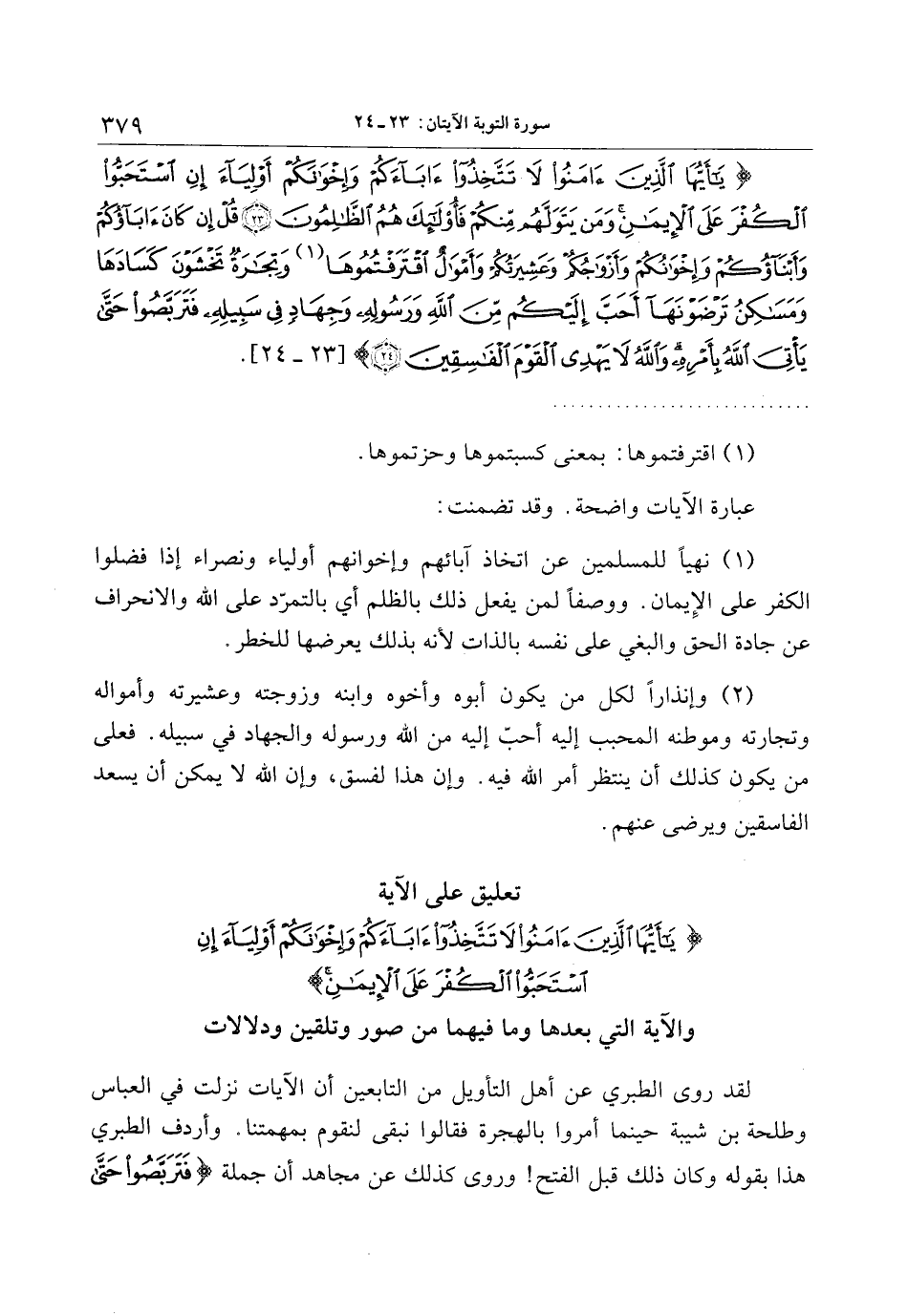 يا أَيُّهَا الَّذِينَ آمَنُوا لا تَتَّخِذُوا آباءَكُمْ وَإِخْوانَكُمْ أَوْلِياءَ إِنِ اسْتَحَبُّوا الْكُفْرَ عَلَى الْإِيمانِ وَمَنْ يَتَوَلَّهُمْ مِنْكُمْ فَأُولئِكَ هُمُ الظَّالِمُونَ (23) قُلْ إِنْ كانَ آباؤُكُمْ وَأَبْناؤُكُمْ وَإِخْوانُكُمْ وَأَزْواجُكُمْ وَعَشِيرَتُكُمْ وَأَمْوالٌ اقْتَرَفْتُمُوها وَتِجارَةٌ تَخْشَوْنَ كَسادَها وَمَساكِنُ تَرْضَوْنَها أَحَبَّ إِلَيْكُمْ مِنَ اللَّهِ وَرَسُولِهِ وَجِهادٍ فِي سَبِيلِهِ فَتَرَبَّصُوا حَتَّى يَأْتِيَ اللَّهُ بِأَمْرِهِ وَاللَّهُ لا يَهْدِي الْقَوْمَ الْفاسِقِينَ (24)