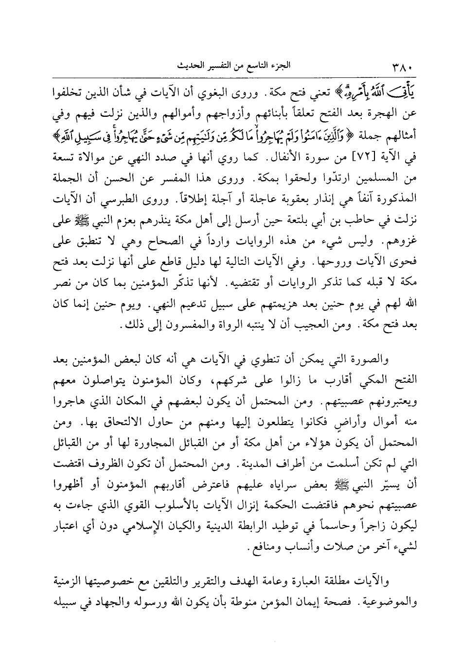 تعني فتح مكة. وروى البغوي أن الآيات في شأن الذين تخلفوا عن الهجرة بعد الفتح تعلقا بأبنائهم وأزواجهم وأموالهم والذين نزلت فيهم وفي أمثالهم جملة وَالَّذِينَ آمَنُوا وَلَمْ يُهاجِرُوا ما لَكُمْ مِنْ وَلايَتِهِمْ مِنْ شَيْءٍ حَتَّى يُهاجِرُوا في الآية [72] من سورة الأنفال. كما روي أنها في صدد النهي عن موالاة تسعة من المسلمين ارتدّوا ولحقوا بمكة. وروى هذا المفسر عن الحسن أن الجملة المذكورة آنفا هي إنذار بعقوبة عاجلة أو آجلة إطلاقا. وروى الطبرسي أن الآيات نزلت في حاطب بن أبي بلتعة حين أرسل إلى أهل مكة ينذرهم بعزم النبي صلى الله عليه وسلم على غزوهم. وليس شيء من هذه الروايات واردا في الصحاح وهي لا تنطبق على فحوى الآيات وروحها. وفي الآيات التالية لها دليل قاطع على أنها نزلت بعد فتح مكة لا قبله كما تذكر الروايات أو تقتضيه. لأنها تذكّر المؤمنين بما كان من نصر الله لهم في يوم حنين بعد هزيمتهم على سبيل تدعيم النهي. ويوم حنين إنما كان بعد فتح مكة. ومن العجيب أن لا ينتبه الرواة والمفسرون إلى ذلك.