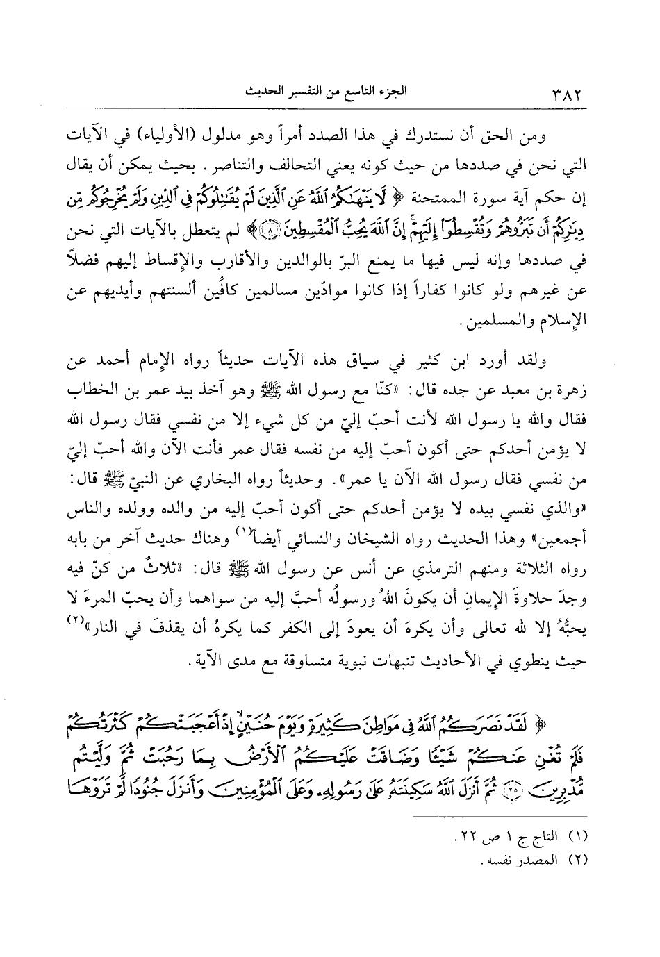 ولقد أورد ابن كثير في سياق هذه الآيات حديثا رواه الإمام أحمد عن زهرة بن معبد عن جده قال: «كنّا مع رسول الله صلى الله عليه وسلم وهو آخذ بيد عمر بن الخطاب فقال والله يا رسول الله لأنت أحبّ إليّ من كل شيء إلا من نفسي فقال رسول الله لا يؤمن أحدكم حتى أكون أحبّ إليه من نفسه فقال عمر فأنت الآن والله أحبّ إليّ من نفسي فقال رسول الله الآن يا عمر» . وحديثا رواه البخاري عن النبيّ صلى الله عليه وسلم قال: