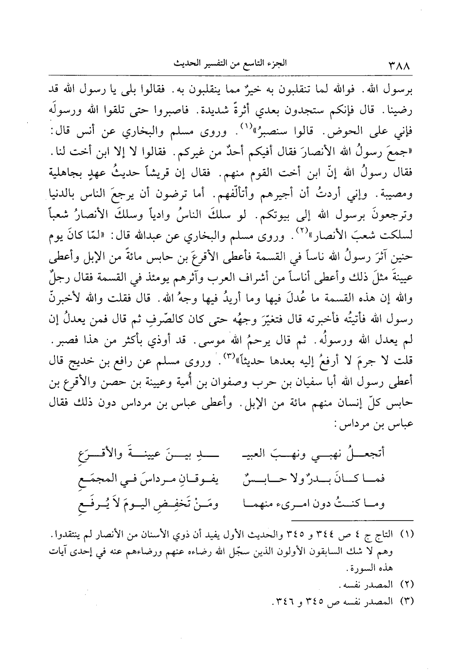 قلت لا جرم لا أرفع إليه بعدها حديثا» «3» . وروى مسلم عن رافع بن خديج قال أعطى رسول الله أبا سفيان بن حرب وصفوان بن أمية وعيينة بن حصن والأقرع بن حابس كلّ إنسان منهم مائة من الإبل. وأعطى عباس بن مرداس دون ذلك فقال عباس بن مرداس: