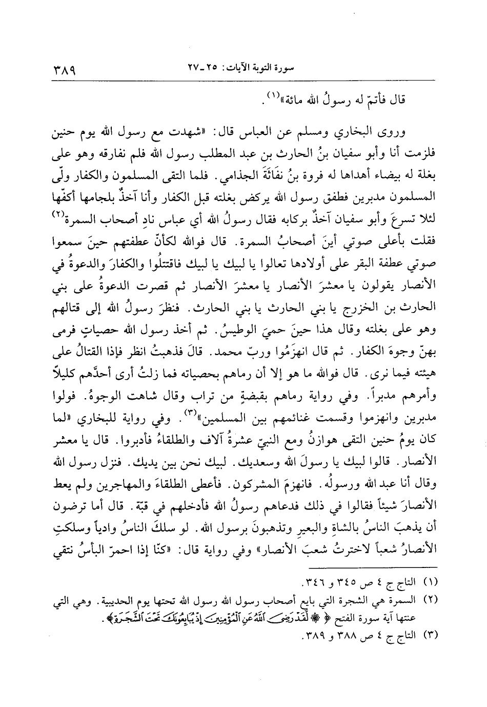 وروى البخاري ومسلم عن العباس قال: «شهدت مع رسول الله يوم حنين فلزمت أنا وأبو سفيان بن الحارث بن عبد المطلب رسول الله فلم نفارقه وهو على بغلة له بيضاء أهداها له فروة بن نفاثة الجذامي. فلما التقى المسلمون والكفار ولّى المسلمون مدبرين فطفق رسول الله يركض بغلته قبل الكفار وأنا آخذ بلجامها أكفّها لئلا تسرع وأبو سفيان آخذ بركابه فقال رسول الله أي عباس ناد أصحاب السمرة «2» فقلت بأعلى صوتي أين أصحاب السمرة. قال فو الله لكأنّ عطفتهم حين سمعوا صوتي عطفة البقر على أولادها تعالوا يا لبيك يا لبيك فاقتتلوا والكفار والدعوة في الأنصار يقولون يا معشر الأنصار يا معشر الأنصار ثم قصرت الدعوة على بني الحارث بن الخزرج يا بني الحارث يا بني الحارث. فنظر رسول الله إلى قتالهم وهو على بغلته وقال هذا حين حمي الوطيس. ثم أخذ رسول الله حصيات فرمى بهنّ وجوه الكفار. ثم قال انهزموا وربّ محمد. قال فذهبت انظر فإذا القتال على هيئته فيما نرى. قال فو الله ما هو إلا أن رماهم بحصياته فما زلت أرى أحدّهم كليلا وأمرهم مدبرا. وفي رواية رماهم بقبضة من تراب وقال شاهت الوجوه. فولوا مدبرين وانهزموا وقسمت غنائمهم بين المسلمين» «3» . وفي رواية للبخاري «لما كان يوم حنين التقى هوازن ومع النبيّ عشرة آلاف والطلقاء فأدبروا. قال يا معشر الأنصار. قالوا لبيك يا رسول الله وسعديك. لبيك نحن بين يديك. فنزل رسول الله وقال أنا عبد الله ورسوله. فانهزم المشركون. فأعطى الطلقاء والمهاجرين ولم يعط الأنصار شيئا فقالوا في ذلك فدعاهم رسول الله فأدخلهم في قبّة. قال أما ترضون أن يذهب الناس بالشاة والبعير وتذهبون برسول الله. لو سلك الناس واديا وسلكت الأنصار شعبا لاخترت شعب الأنصار» وفي رواية قال: «كنّا إذا احمرّ البأس نتقي