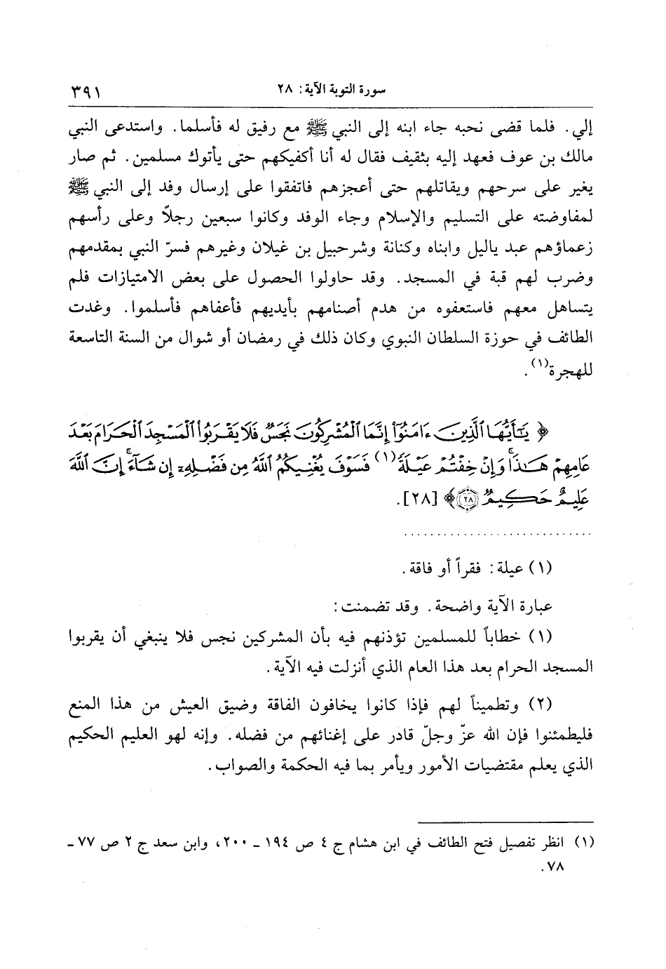 يا أَيُّهَا الَّذِينَ آمَنُوا إِنَّمَا الْمُشْرِكُونَ نَجَسٌ فَلا يَقْرَبُوا الْمَسْجِدَ الْحَرامَ بَعْدَ عامِهِمْ هذا وَإِنْ خِفْتُمْ عَيْلَةً فَسَوْفَ يُغْنِيكُمُ اللَّهُ مِنْ فَضْلِهِ إِنْ شاءَ إِنَّ اللَّهَ عَلِيمٌ حَكِيمٌ (28)