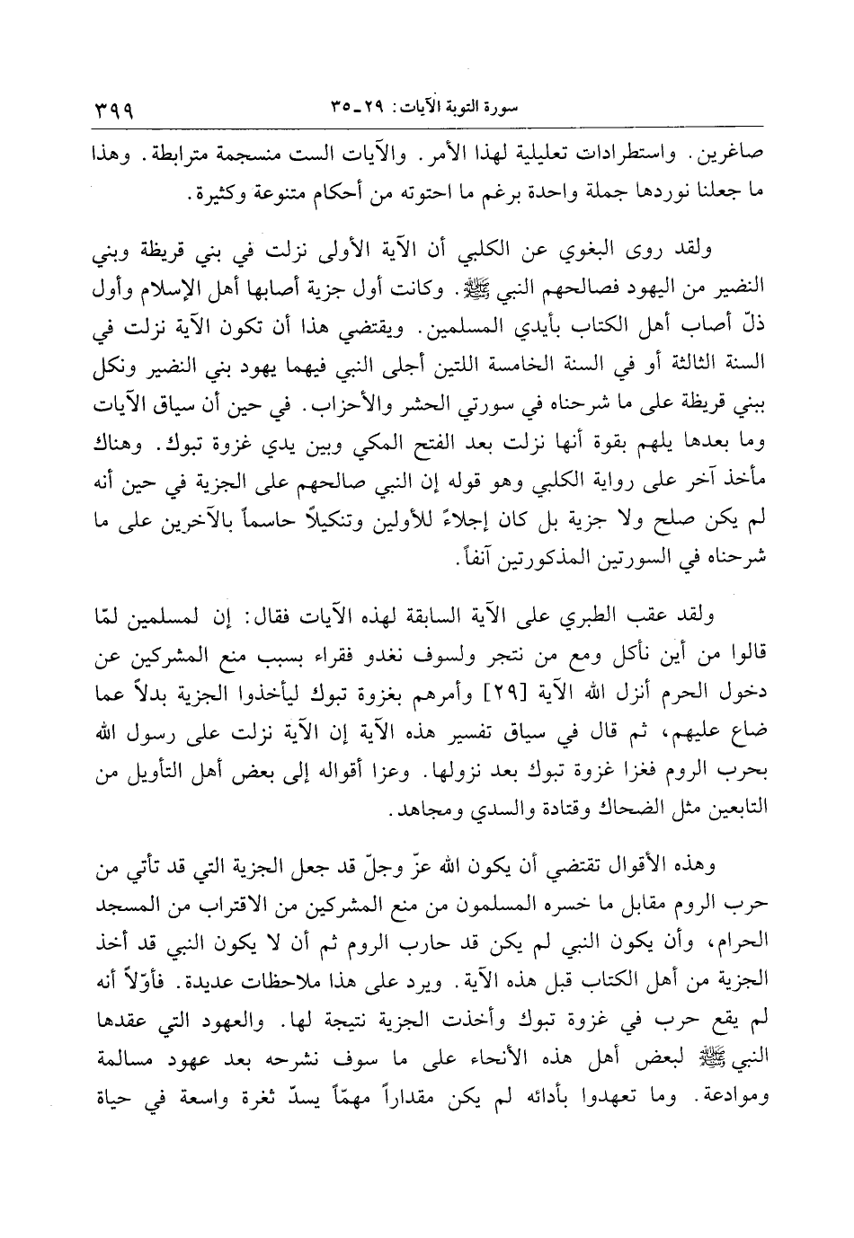 ولقد روى البغوي عن الكلبي أن الآية الأولى نزلت في بني قريظة وبني النضير من اليهود فصالحهم النبي صلى الله عليه وسلم. وكانت أول جزية أصابها أهل الإسلام وأول ذلّ أصاب أهل الكتاب بأيدي المسلمين. ويقتضي هذا أن تكون الآية نزلت في السنة الثالثة أو في السنة الخامسة اللتين أجلى النبي فيهما يهود بني النضير ونكل ببني قريظة على ما شرحناه في سورتي الحشر والأحزاب. في حين أن سياق الآيات وما بعدها يلهم بقوة أنها نزلت بعد الفتح المكي وبين يدي غزوة تبوك. وهناك مأخذ آخر على رواية الكلبي وهو قوله إن النبي صالحهم على الجزية في حين أنه لم يكن صلح ولا جزية بل كان إجلاء للأولين وتنكيلا حاسما بالآخرين على ما شرحناه في السورتين المذكورتين آنفا.