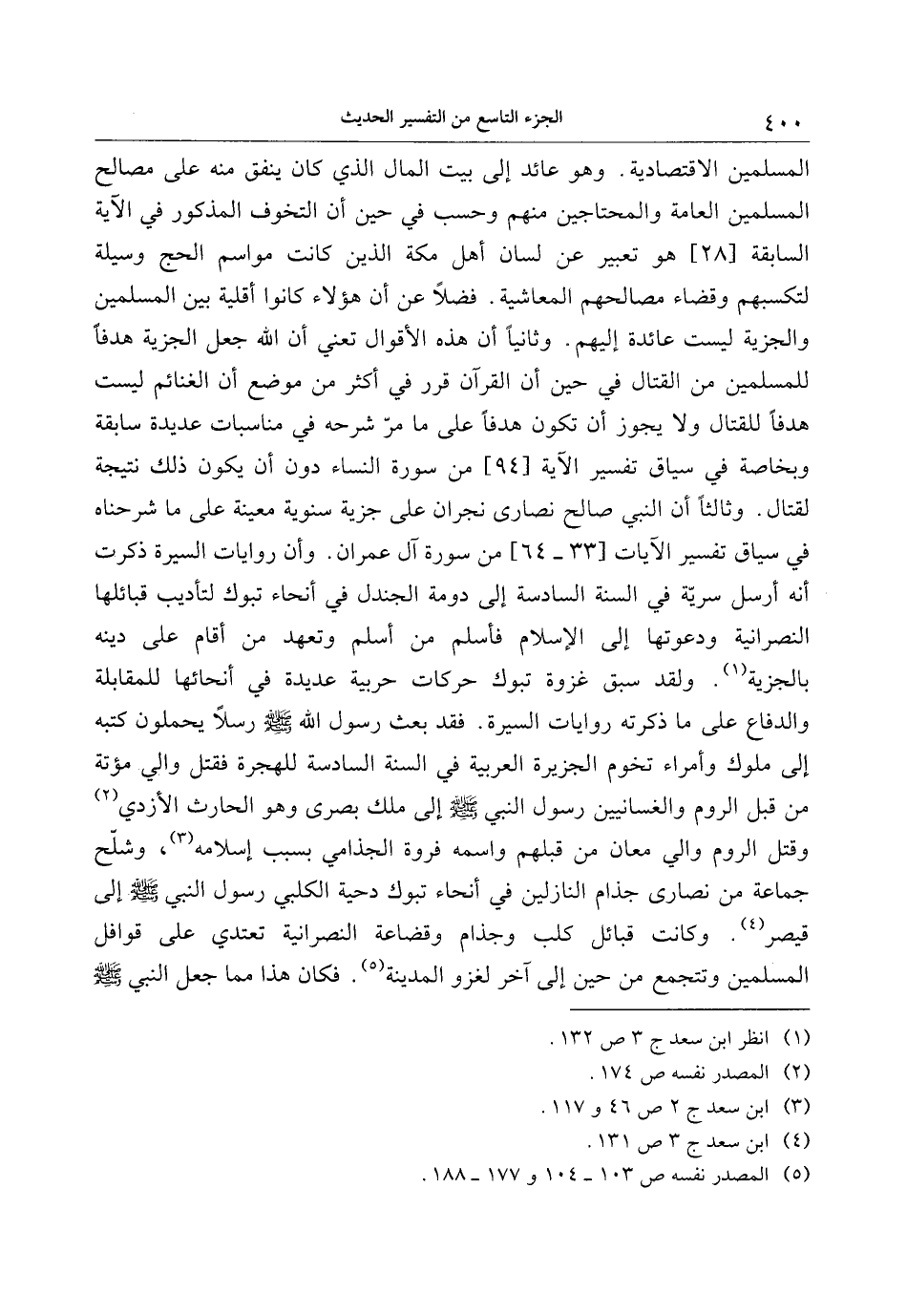 المسلمين الاقتصادية. وهو عائد إلى بيت المال الذي كان ينفق منه على مصالح المسلمين العامة والمحتاجين منهم وحسب في حين أن التخوف المذكور في الآية السابقة [28] هو تعبير عن لسان أهل مكة الذين كانت مواسم الحج وسيلة لتكسبهم وقضاء مصالحهم المعاشية. فضلا عن أن هؤلاء كانوا أقلية بين المسلمين والجزية ليست عائدة إليهم. وثانيا أن هذه الأقوال تعني أن الله جعل الجزية هدفا للمسلمين من القتال في حين أن القرآن قرر في أكثر من موضع أن الغنائم ليست هدفا للقتال ولا يجوز أن تكون هدفا على ما مرّ شرحه في مناسبات عديدة سابقة وبخاصة في سياق تفسير الآية [94] من سورة النساء دون أن يكون ذلك نتيجة لقتال. وثالثا أن النبي صالح نصارى نجران على جزية سنوية معينة على ما شرحناه في سياق تفسير الآيات [33- 64] من سورة آل عمران. وأن روايات السيرة ذكرت أنه أرسل سريّة في السنة السادسة إلى دومة الجندل في أنحاء تبوك لتأديب قبائلها النصرانية ودعوتها إلى الإسلام فأسلم من أسلم وتعهد من أقام على دينه بالجزية «1» . ولقد سبق غزوة تبوك حركات حربية عديدة في أنحائها للمقابلة والدفاع على ما ذكرته روايات السيرة. فقد بعث رسول الله صلى الله عليه وسلم رسلا يحملون كتبه إلى ملوك وأمراء تخوم الجزيرة العربية في السنة السادسة للهجرة فقتل والي مؤتة من قبل الروم والغسانيين رسول النبي صلى الله عليه وسلم إلى ملك بصرى وهو الحارث الأزدي «2» وقتل الروم والي معان من قبلهم واسمه فروة الجذامي بسبب إسلامه «3» ، وشلّح جماعة من نصارى جذام النازلين في أنحاء تبوك دحية الكلبي رسول النبي صلى الله عليه وسلم إلى قيصر «4» . وكانت قبائل كلب وجذام وقضاعة النصرانية تعتدي على قوافل المسلمين وتتجمع من حين إلى آخر لغزو المدينة «5» . فكان هذا مما جعل النبي صلى الله عليه وسلم