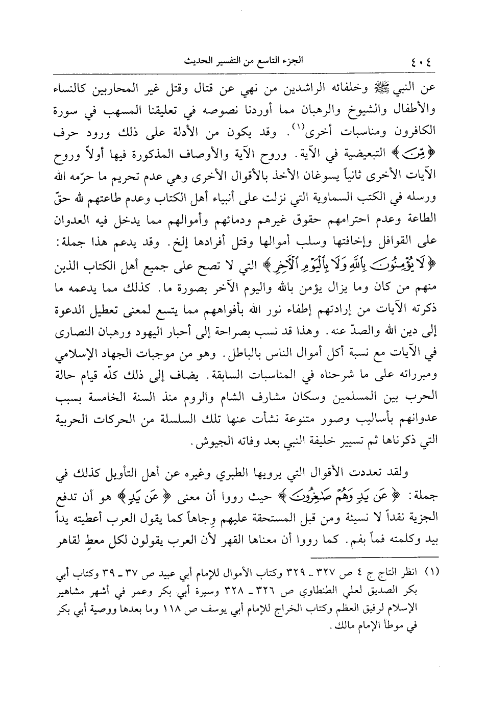 لا يُؤْمِنُونَ بِاللَّهِ وَلا بِالْيَوْمِ الْآخِرِ التي لا تصح على جميع أهل الكتاب الذين منهم من كان وما يزال يؤمن بالله واليوم الآخر بصورة ما. كذلك مما يدعمه ما ذكرته الآيات من إرادتهم إطفاء نور الله بأفواههم مما يتسع لمعنى تعطيل الدعوة إلى دين الله والصدّ عنه. وهذا قد نسب بصراحة إلى أحبار اليهود ورهبان النصارى في الآيات مع نسبة أكل أموال الناس بالباطل. وهو من موجبات الجهاد الإسلامي ومبرراته على ما شرحناه في المناسبات السابقة. يضاف إلى ذلك كلّه قيام حالة الحرب بين المسلمين وسكان مشارف الشام والروم منذ السنة الخامسة بسبب عدوانهم بأساليب وصور متنوعة نشأت عنها تلك السلسلة من الحركات الحربية التي ذكرناها ثم تسيير خليفة النبي بعد وفاته الجيوش.