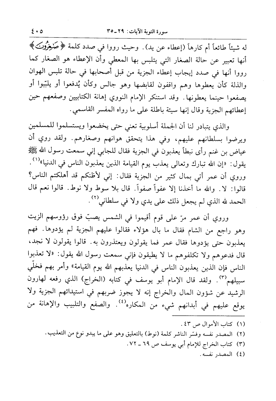 له شيئا طائعا أم كارها (إعطاء عن يد) . وحيث رووا في صدد كلمة صاغِرُونَ أنها تعبير عن حالة الصغار التي يتلبس بها المعطي وأن الإعطاء هو الصغار كما رووا أنها في صدد إيجاب إعطاء الجزية من قبل أصحابها في حالة تلبس الهوان والذلة كأن يعطوها وهم واقفون لقابضها وهو جالس وكأن يدفعوا أو يلبّبوا أو يصفعوا حينما يعطونها. وقد استنكر الإمام النووي إهانة الكتابيين وصفعهم حين إعطائهم الجزية وقال إنها سيئة باطلة على ما رواه المفسر القاسمي.