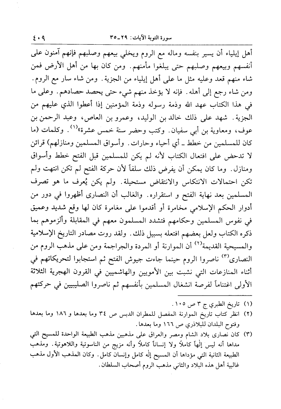 (3) كان نصارى بلاد الشام ومصر والعراق على مذهبين مذهب الطبيعة الواحدة للمسيح التي مداها أنه ليس إلها كاملا ولا إنسانا كاملا وأنه مزيج من الناسوتية واللاهوتية. ومذهب الطبيعة الثانية التي مؤداها أن المسيح إله كامل وإنسان كامل. وكان المذهب الأول مذهب غالبية أهل هذه البلاد والثاني مذهب الروم أصحاب السلطان.