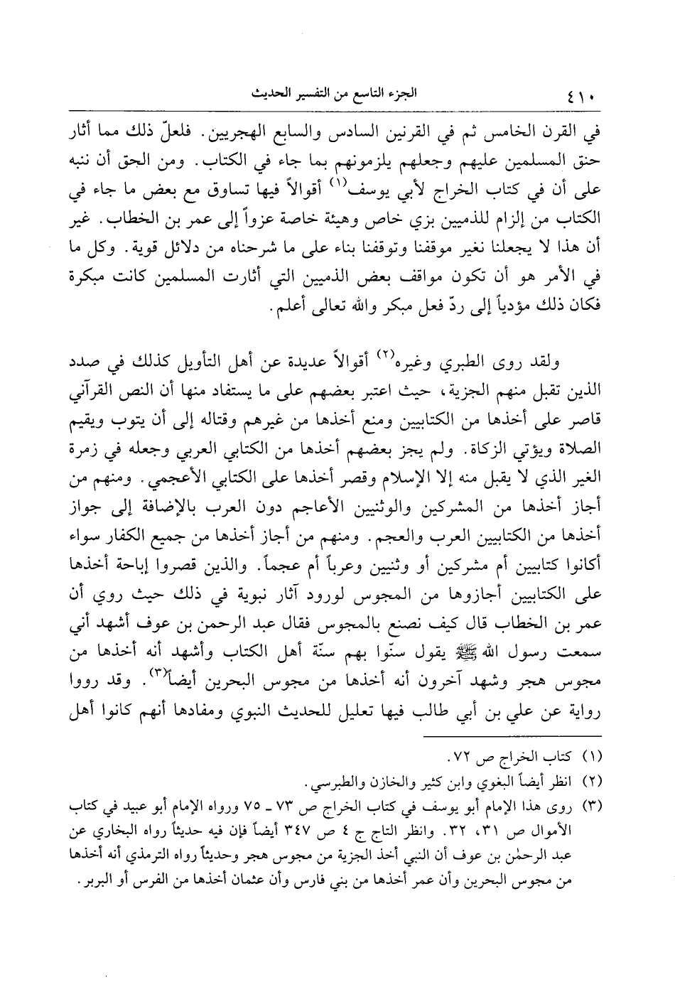 (3) روى هذا الإمام أبو يوسف في كتاب الخراج ص 73- 75 ورواه الإمام أبو عبيد في كتاب الأموال ص 31، 32. وانظر التاج ج 4 ص 347 أيضا فإن فيه حديثا رواه البخاري عن عبد الرحمن بن عوف أن النبي أخذ الجزية من مجوس هجر وحديثا رواه الترمذي أنه أخذها من مجوس البحرين وأن عمر أخذها من بني فارس وأن عثمان أخذها من الفرس أو البربر.