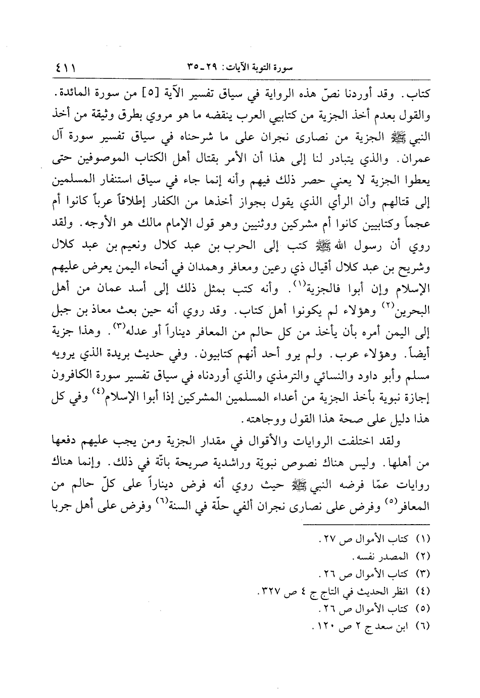 والقول بعدم أخذ الجزية من كتابيي العرب ينقضه ما هو مروي بطرق وثيقة من أخذ النبي صلى الله عليه وسلم الجزية من نصارى نجران على ما شرحناه في سياق تفسير سورة آل عمران. والذي يتبادر لنا إلى هذا أن الأمر بقتال أهل الكتاب الموصوفين حتى يعطوا الجزية لا يعني حصر ذلك فيهم وأنه إنما جاء في سياق استنفار المسلمين إلى قتالهم وأن الرأي الذي يقول بجواز أخذها من الكفار إطلاقا عربا كانوا أم عجما وكتابيين كانوا أم مشركين ووثنيين وهو قول الإمام مالك هو الأوجه. ولقد روي أن رسول الله صلى الله عليه وسلم كتب إلى الحرب بن عبد كلال ونعيم بن عبد كلال وشريح بن عبد كلال أقيال ذي رعين ومعافر وهمدان في أنحاء اليمن يعرض عليهم الإسلام وإن أبوا فالجزية «1» . وأنه كتب بمثل ذلك إلى أسد عمان من أهل البحرين «2» وهؤلاء لم يكونوا أهل كتاب. وقد روي أنه حين بعث معاذ بن جبل إلى اليمن أمره بأن يأخذ من كل حالم من المعافر دينارا أو عدله «3» . وهذا جزية أيضا. وهؤلاء عرب. ولم يرو أحد أنهم كتابيون. وفي حديث بريدة الذي يرويه مسلم وأبو داود والنسائي والترمذي والذي أوردناه في سياق تفسير سورة الكافرون إجازة نبوية بأخذ الجزية من أعداء المسلمين المشركين إذا أبوا الإسلام «4» وفي كل هذا دليل على صحة هذا القول ووجاهته.