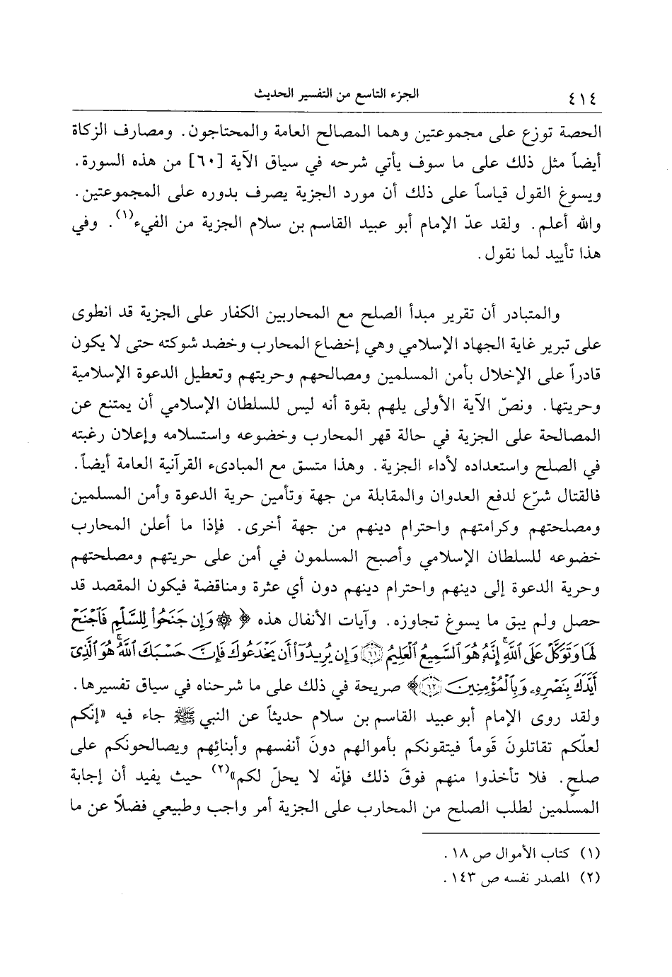 ولقد روى الإمام أبو عبيد القاسم بن سلام حديثا عن النبي صلى الله عليه وسلم جاء فيه «إنّكم لعلّكم تقاتلون قوما فيتقونكم بأموالهم دون أنفسهم وأبنائهم ويصالحونكم على صلح. فلا تأخذوا منهم فوق ذلك فإنّه لا يحلّ لكم» «2» حيث يفيد أن إجابة المسلمين لطلب الصلح من المحارب على الجزية أمر واجب وطبيعي فضلا عن ما