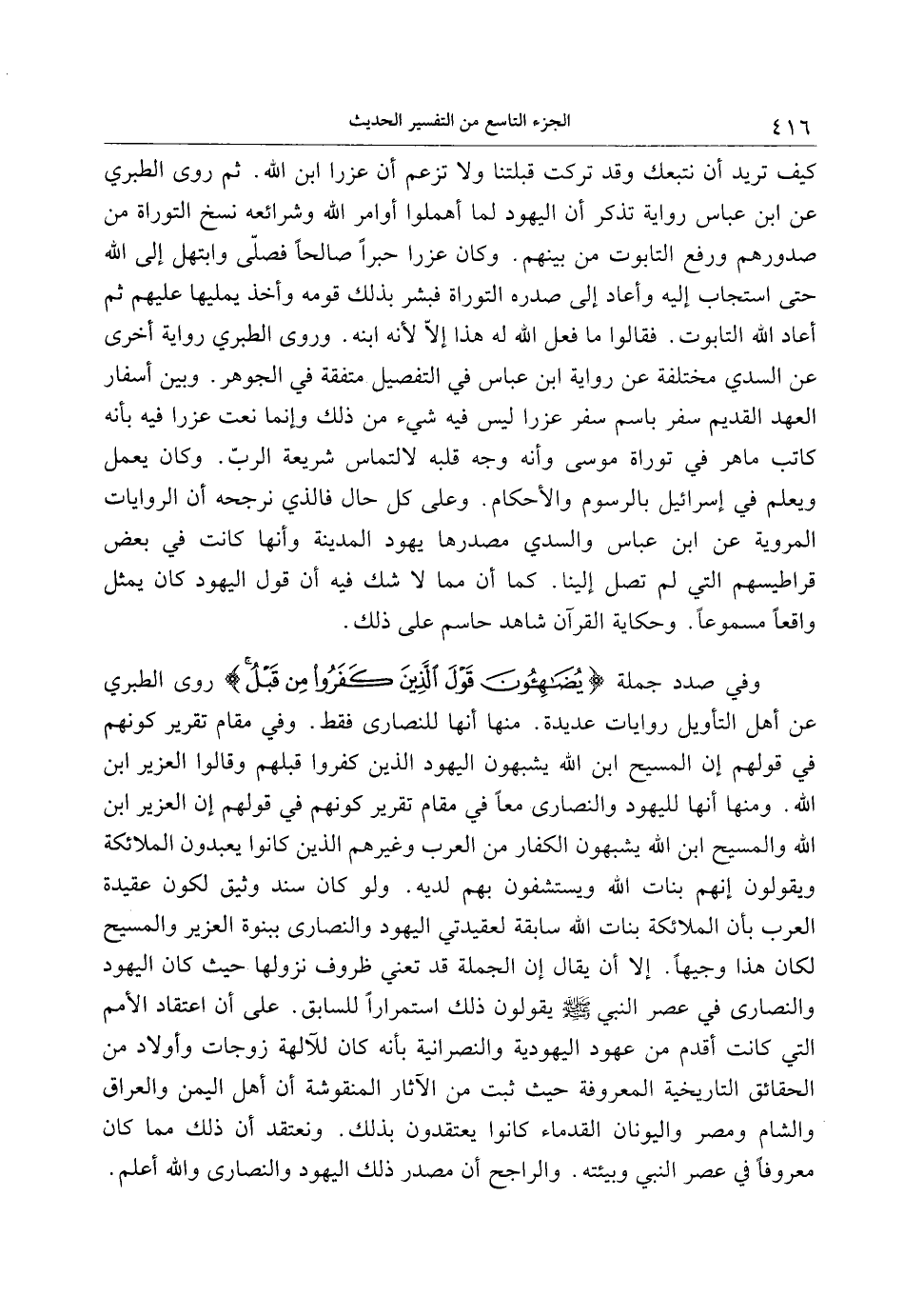 كيف تريد أن نتبعك وقد تركت قبلتنا ولا تزعم أن عزرا ابن الله. ثم روى الطبري عن ابن عباس رواية تذكر أن اليهود لما أهملوا أوامر الله وشرائعه نسخ التوراة من صدورهم ورفع التابوت من بينهم. وكان عزرا حبرا صالحا فصلّى وابتهل إلى الله حتى استجاب إليه وأعاد إلى صدره التوراة فبشر بذلك قومه وأخذ يمليها عليهم ثم أعاد الله التابوت. فقالوا ما فعل الله له هذا إلّا لأنه ابنه. وروى الطبري رواية أخرى عن السدي مختلفة عن رواية ابن عباس في التفصيل متفقة في الجوهر. وبين أسفار العهد القديم سفر باسم سفر عزرا ليس فيه شيء من ذلك وإنما نعت عزرا فيه بأنه كاتب ماهر في توراة موسى وأنه وجه قلبه لالتماس شريعة الربّ. وكان يعمل ويعلم في إسرائيل بالرسوم والأحكام. وعلى كل حال فالذي نرجحه أن الروايات المروية عن ابن عباس والسدي مصدرها يهود المدينة وأنها كانت في بعض قراطيسهم التي لم تصل إلينا. كما أن مما لا شك فيه أن قول اليهود كان يمثل واقعا مسموعا. وحكاية القرآن شاهد حاسم على ذلك.