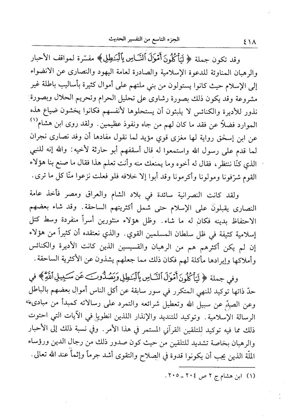 وقد تكون جملة لَيَأْكُلُونَ أَمْوالَ النَّاسِ بِالْباطِلِ مفسّرة لمواقف الأحبار والرهبان المناوئة للدعوة الإسلامية والصادرة لعامة اليهود والنصارى عن الانضواء إلى الإسلام حيث كانوا يستولون من بني ملتهم على أموال كثيرة بأساليب باطلة غير مشروعة وقد يكون ذلك بصورة رشاوى على تحليل الحرام وتحريم الحلال وبصورة نذور للأديرة والكنائس لا يلبثون أن يستحلوها لأنفسهم فكانوا يخشون ضياع هذه الموارد فضلا عن فقد ما كان لهم من جاه ونفوذ عظيمين. ولقد روى ابن هشام «1» عن ابن إسحق رواية لها مغزى قوي مؤيد لما نقول مفادها أن وفد نصارى نجران لما قدم على رسول الله واستمعوا له قال أسقفهم أبو حارثة لأخيه: والله إنه للنبي الذي كنّا ننتظر، فقال له أخوه وما يمنعك منه وأنت تعلم هذا فقال ما صنع بنا هؤلاء القوم شرّفونا ومولونا وأكرمونا وقد أبوا إلا خلافه فلو فعلت نزعوا منّا كل ما ترى.