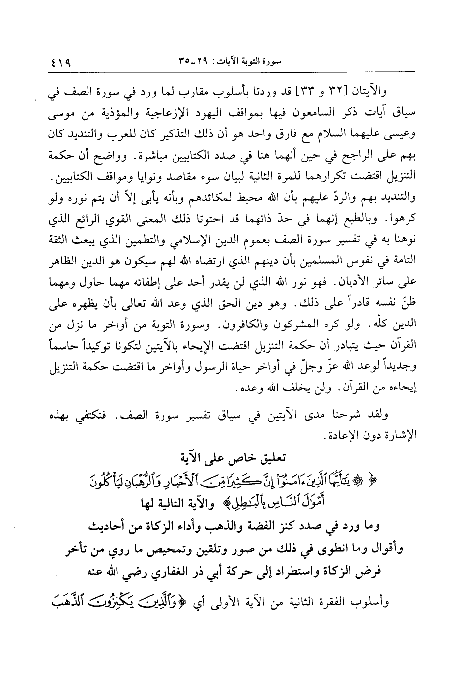 تعليق خاص على الآية يا أَيُّهَا الَّذِينَ آمَنُوا إِنَّ كَثِيراً مِنَ الْأَحْبارِ وَالرُّهْبانِ لَيَأْكُلُونَ أَمْوالَ النَّاسِ بِالْباطِلِ والآية التالية لها وما ورد في صدد كنز الفضة والذهب وأداء الزكاة من أحاديث وأقوال وما انطوى في ذلك من صور وتلقين وتمحيص ما روي من تأخر فرض الزكاة واستطراد إلى حركة أبي ذر الغفاري رضي الله عنه