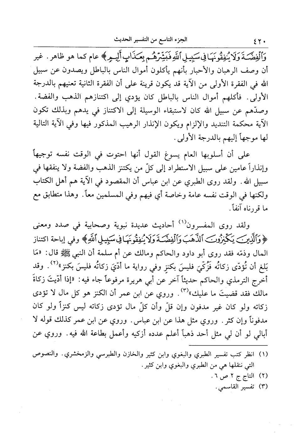 عام كما هو ظاهر. غير أن وصف الرهبان والأحبار بأنهم يأكلون أموال الناس بالباطل ويصدون عن سبيل الله في الفقرة الأولى من الآية قد يكون قرينة على أن الفقرة الثانية تعنيهم بالدرجة الأولى. فأكلهم أموال الناس بالباطل كان يؤدي إلى اكتنازهم الذهب والفضة.