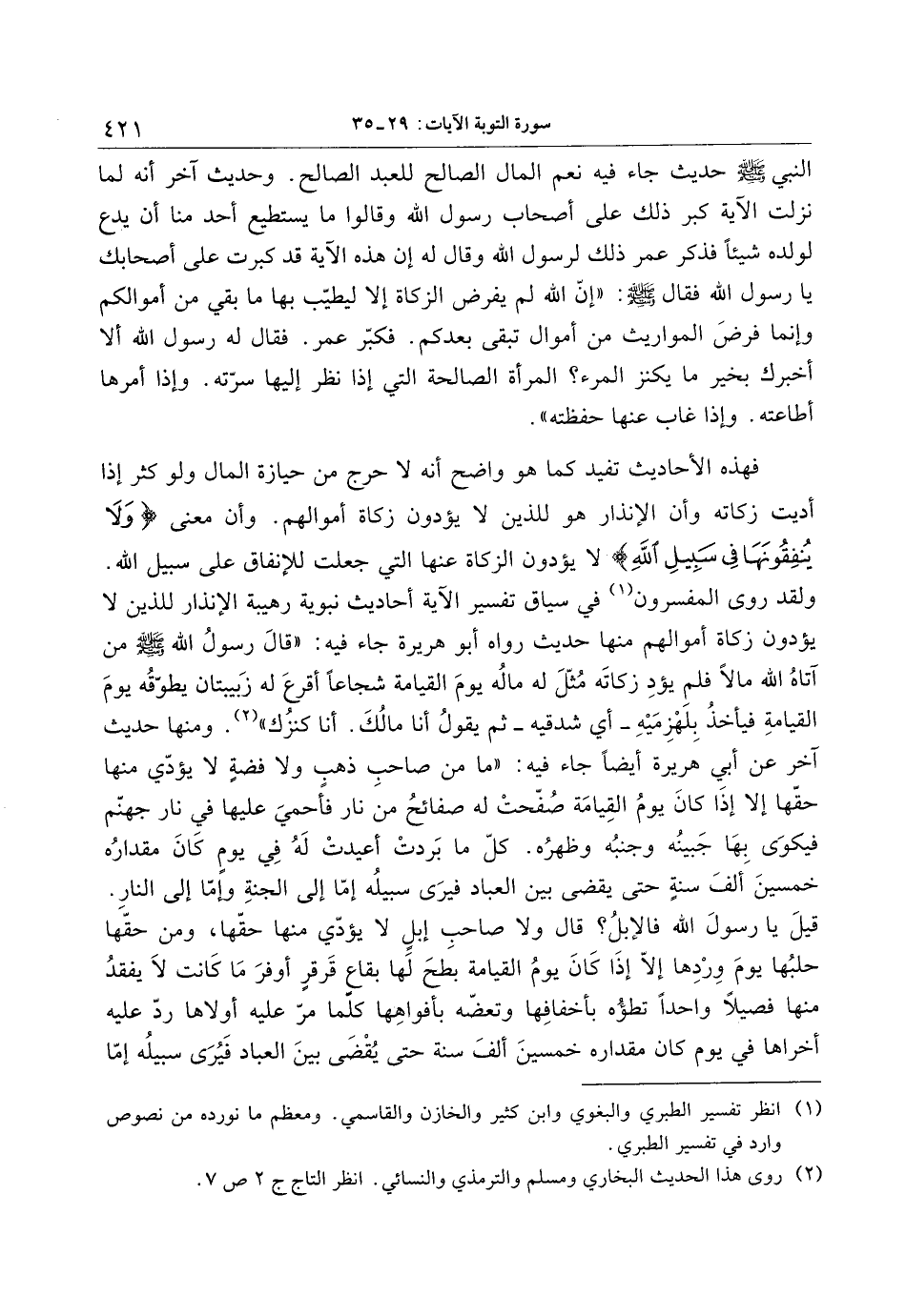 فهذه الأحاديث تفيد كما هو واضح أنه لا حرج من حيازة المال ولو كثر إذا أديت زكاته وأن الإنذار هو للذين لا يؤدون زكاة أموالهم. وأن معنى وَلا يُنْفِقُونَها فِي سَبِيلِ اللَّهِ لا يؤدون الزكاة عنها التي جعلت للإنفاق على سبيل الله.