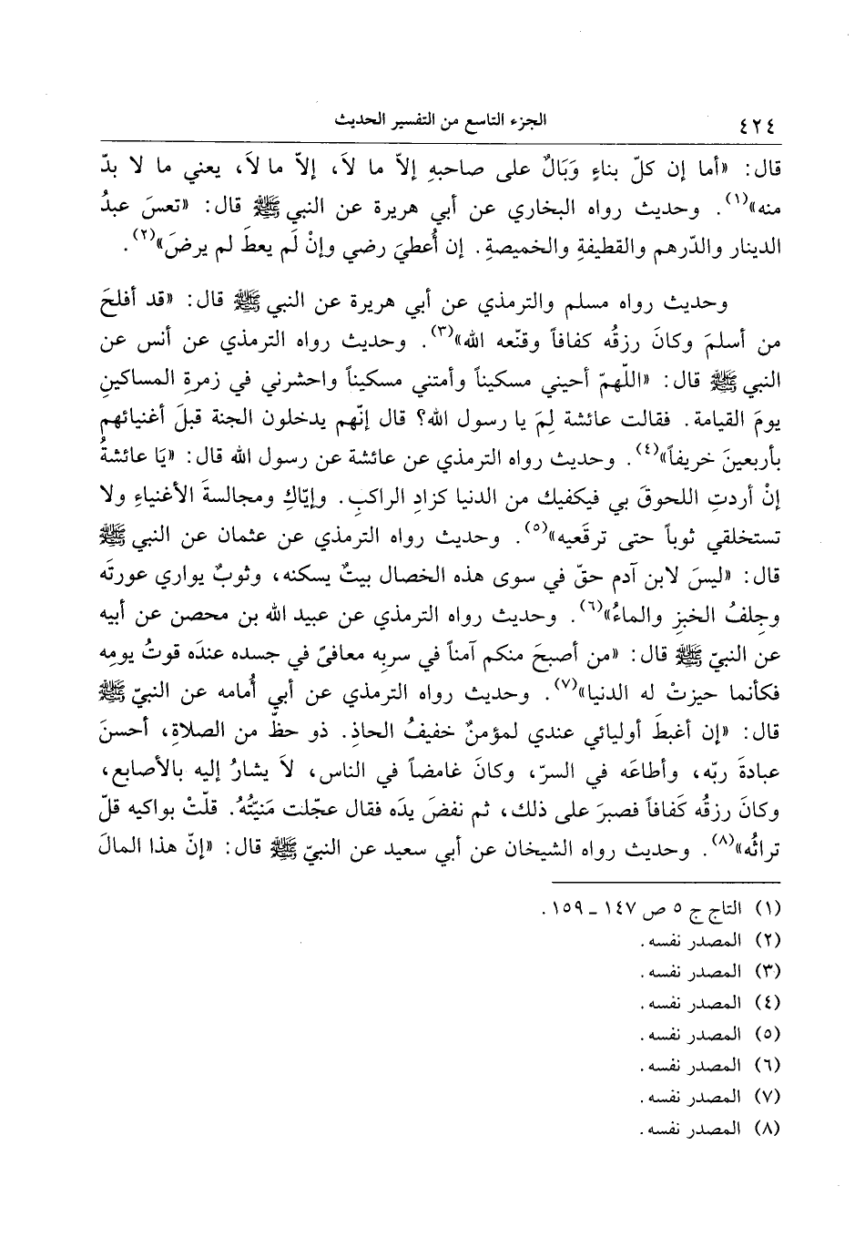 قال: «أما إن كلّ بناء وبال على صاحبه إلّا ما لا، إلّا ما لا، يعني ما لا بدّ منه» «1» . وحديث رواه البخاري عن أبي هريرة عن النبي صلى الله عليه وسلم قال: «تعس عبد الدينار والدّرهم والقطيفة والخميصة. إن أعطي رضي وإن لم يعط لم يرض» «2» .