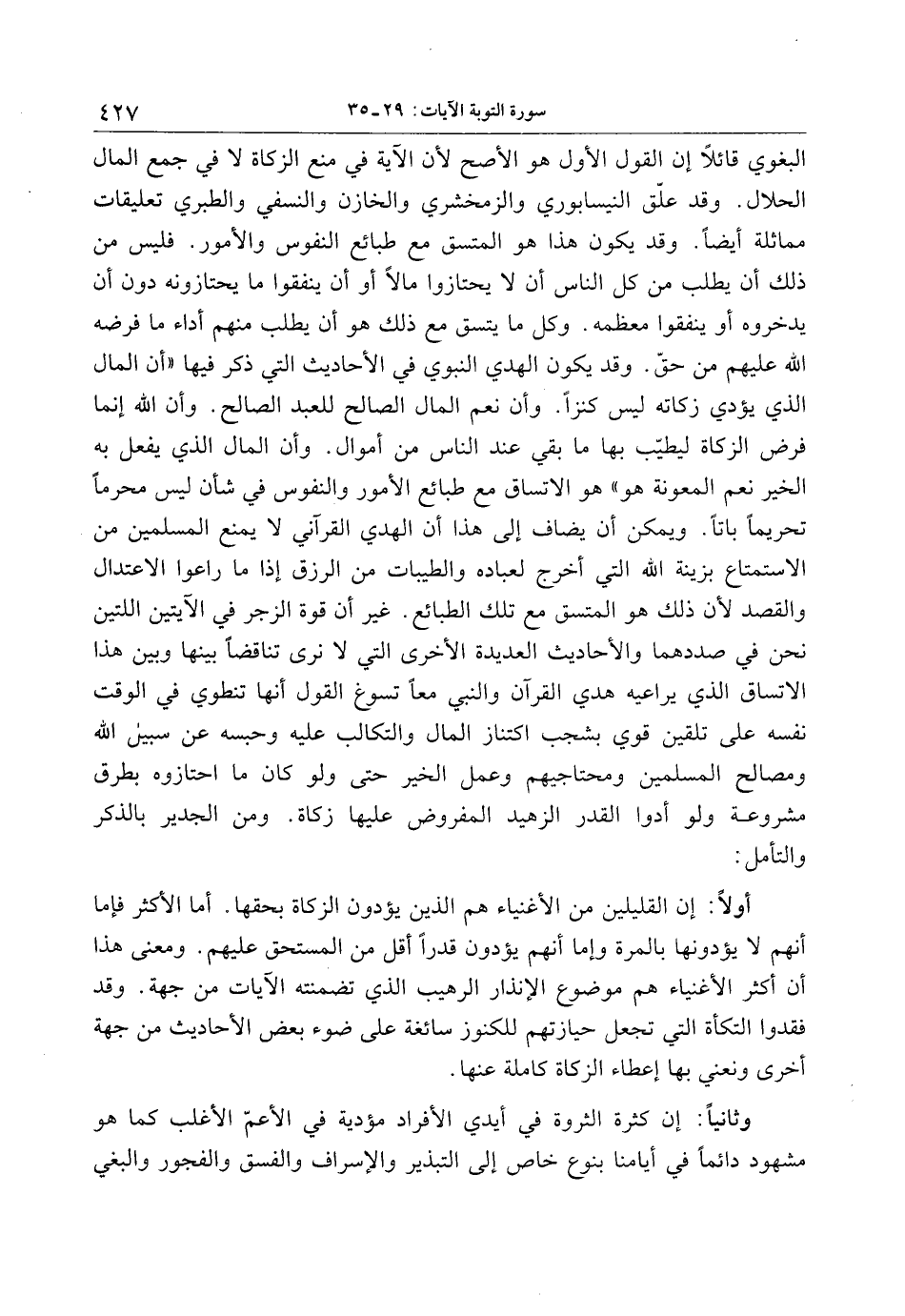 البغوي قائلا إن القول الأول هو الأصح لأن الآية في منع الزكاة لا في جمع المال الحلال. وقد علّق النيسابوري والزمخشري والخازن والنسفي والطبري تعليقات مماثلة أيضا. وقد يكون هذا هو المتسق مع طبائع النفوس والأمور. فليس من ذلك أن يطلب من كل الناس أن لا يحتازوا مالا أو أن ينفقوا ما يحتازونه دون أن يدخروه أو ينفقوا معظمه. وكل ما يتسق مع ذلك هو أن يطلب منهم أداء ما فرضه الله عليهم من حقّ. وقد يكون الهدي النبوي في الأحاديث التي ذكر فيها «أن المال الذي يؤدي زكاته ليس كنزا. وأن نعم المال الصالح للعبد الصالح. وأن الله إنما فرض الزكاة ليطيّب بها ما بقي عند الناس من أموال. وأن المال الذي يفعل به الخير نعم المعونة هو» هو الاتساق مع طبائع الأمور والنفوس في شأن ليس محرما تحريما باتا. ويمكن أن يضاف إلى هذا أن الهدي القرآني لا يمنع المسلمين من الاستمتاع بزينة الله التي أخرج لعباده والطيبات من الرزق إذا ما راعوا الاعتدال والقصد لأن ذلك هو المتسق مع تلك الطبائع. غير أن قوة الزجر في الآيتين اللتين نحن في صددهما والأحاديث العديدة الأخرى التي لا نرى تناقضا بينها وبين هذا الاتساق الذي يراعيه هدي القرآن والنبي معا تسوغ القول أنها تنطوي في الوقت نفسه على تلقين قوي بشجب اكتناز المال والتكالب عليه وحبسه عن سبيل الله ومصالح المسلمين ومحتاجيهم وعمل الخير حتى ولو كان ما احتازوه بطرق مشروعة ولو أدوا القدر الزهيد المفروض عليها زكاة. ومن الجدير بالذكر والتأمل: