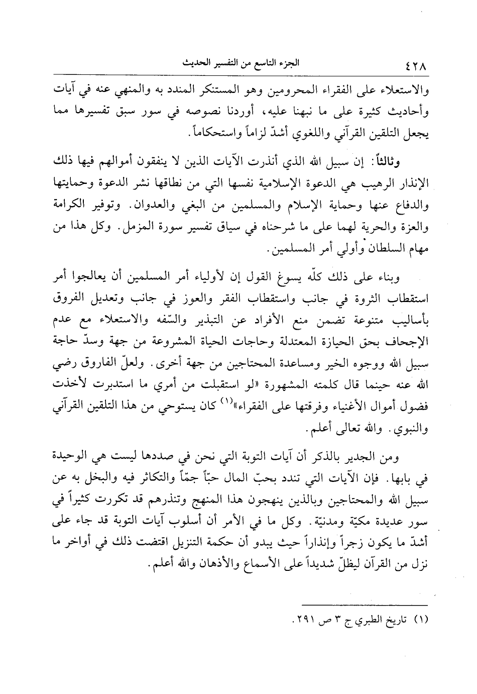 وثالثا: إن سبيل الله الذي أنذرت الآيات الذين لا ينفقون أموالهم فيها ذلك الإنذار الرهيب هي الدعوة الإسلامية نفسها التي من نطاقها نشر الدعوة وحمايتها والدفاع عنها وحماية الإسلام والمسلمين من البغي والعدوان. وتوفير الكرامة والعزة والحرية لهما على ما شرحناه في سياق تفسير سورة المزمل. وكل هذا من مهام السلطان وأولي أمر المسلمين.