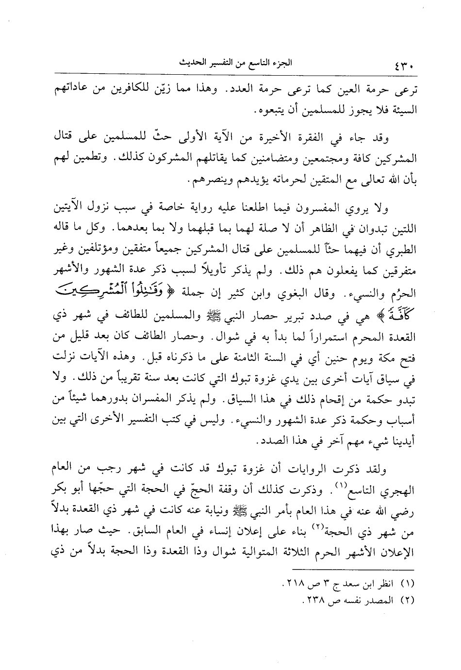 ولا يروي المفسرون فيما اطلعنا عليه رواية خاصة في سبب نزول الآيتين اللتين تبدوان في الظاهر أن لا صلة لهما بما قبلهما ولا بما بعدهما. وكل ما قاله الطبري أن فيهما حثّا للمسلمين على قتال المشركين جميعا متفقين ومؤتلفين وغير متفرقين كما يفعلون هم ذلك. ولم يذكر تأويلا لسبب ذكر عدة الشهور والأشهر الحرم والنسيء. وقال البغوي وابن كثير إن جملة وَقاتِلُوا الْمُشْرِكِينَ كَافَّةً هي في صدد تبرير حصار النبي صلى الله عليه وسلم والمسلمين للطائف في شهر ذي القعدة المحرم استمرارا لما بدأ به في شوال. وحصار الطائف كان بعد قليل من فتح مكة ويوم حنين أي في السنة الثامنة على ما ذكرناه قبل. وهذه الآيات نزلت في سياق آيات أخرى بين يدي غزوة تبوك التي كانت بعد سنة تقريبا من ذلك. ولا تبدو حكمة من إقحام ذلك في هذا السياق. ولم يذكر المفسران بدورهما شيئا من أسباب وحكمة ذكر عدة الشهور والنسيء. وليس في كتب التفسير الأخرى التي بين أيدينا شيء مهم آخر في هذا الصدد.