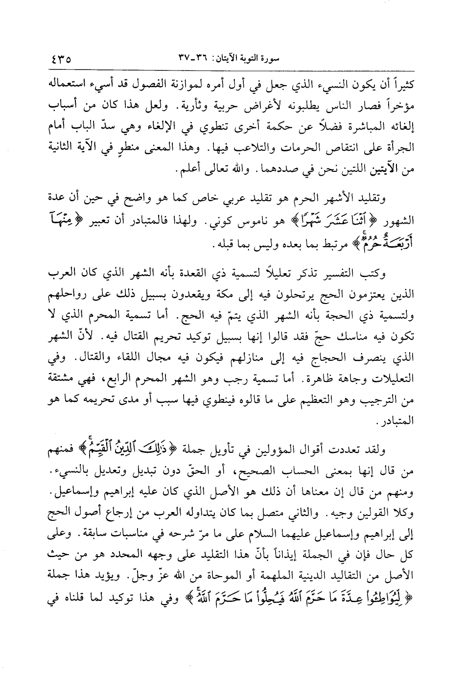 كثيرا أن يكون النسيء الذي جعل في أول أمره لموازنة الفصول قد أسيء استعماله مؤخرا فصار الناس يطلبونه لأغراض حربية وثأرية. ولعل هذا كان من أسباب إلغائه المباشرة فضلا عن حكمة أخرى تنطوي في الإلغاء وهي سدّ الباب أمام الجرأة على انتقاص الحرمات والتلاعب فيها. وهذا المعنى منطو في الآية الثانية من الآيتين اللتين نحن في صددهما. والله تعالى أعلم.