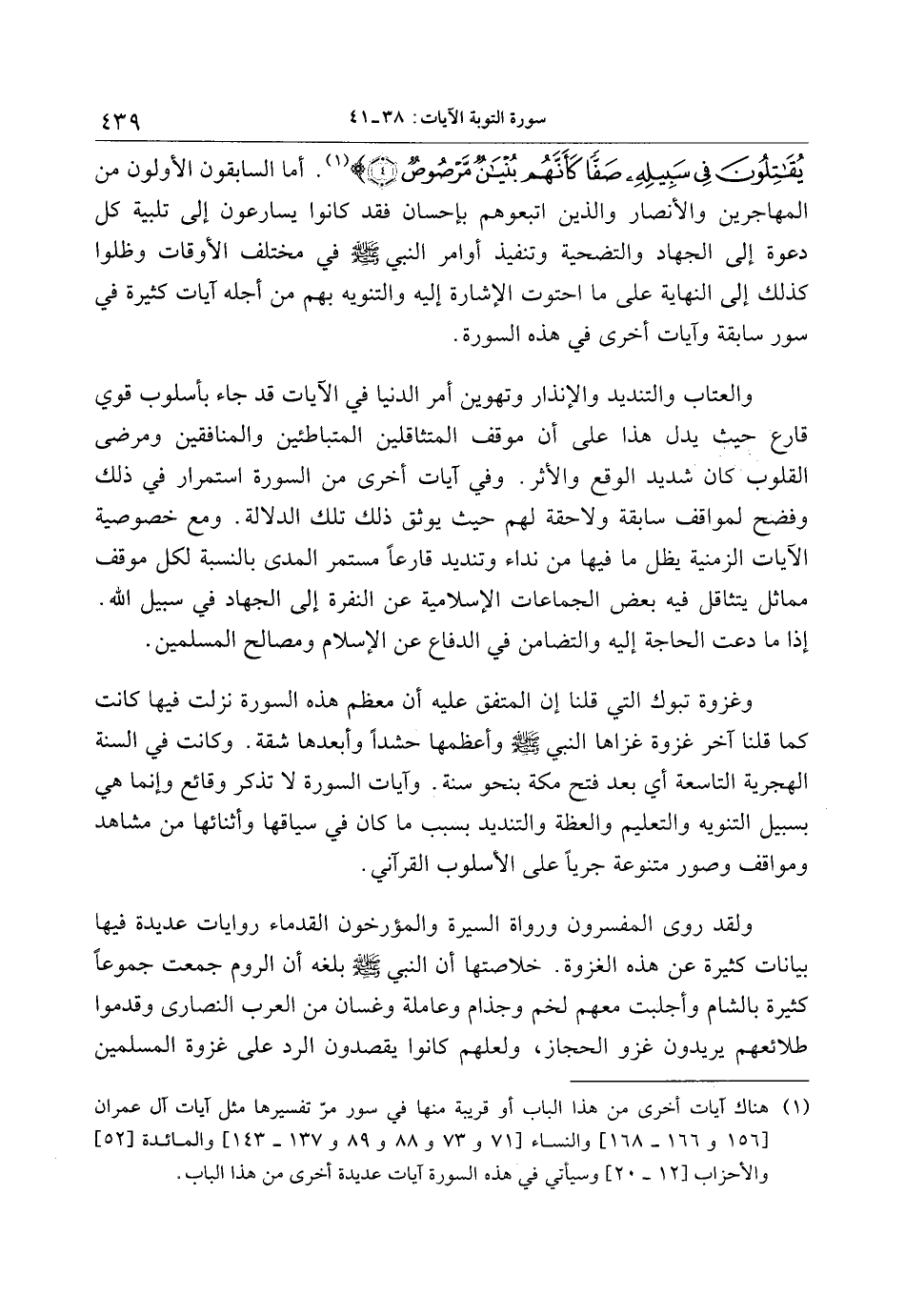 (1) هناك آيات أخرى من هذا الباب أو قريبة منها في سور مرّ تفسيرها مثل آيات آل عمران [156 و 166- 168] والنساء [71 و 73 و 88 و 89 و 137- 143] والمائدة [52] والأحزاب [12- 20] وسيأتي في هذه السورة آيات عديدة أخرى من هذا الباب.