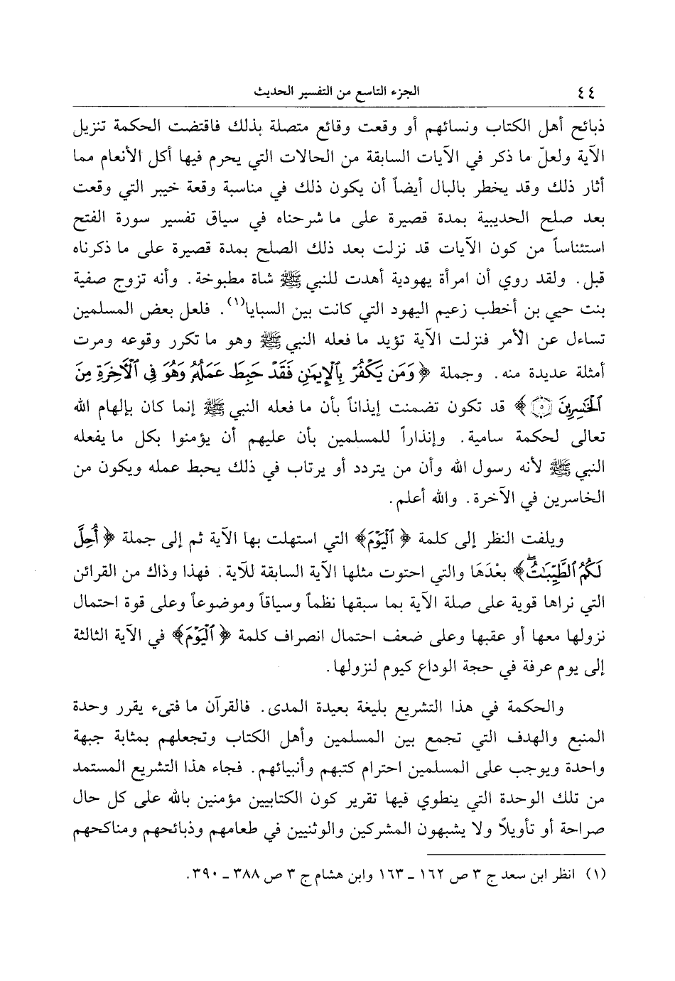 ذبائح أهل الكتاب ونسائهم أو وقعت وقائع متصلة بذلك فاقتضت الحكمة تنزيل الآية ولعلّ ما ذكر في الآيات السابقة من الحالات التي يحرم فيها أكل الأنعام مما أثار ذلك وقد يخطر بالبال أيضا أن يكون ذلك في مناسبة وقعة خيبر التي وقعت بعد صلح الحديبية بمدة قصيرة على ما شرحناه في سياق تفسير سورة الفتح استئناسا من كون الآيات قد نزلت بعد ذلك الصلح بمدة قصيرة على ما ذكرناه قبل. ولقد روي أن امرأة يهودية أهدت للنبي صلى الله عليه وسلم شاة مطبوخة. وأنه تزوج صفية بنت حيي بن أخطب زعيم اليهود التي كانت بين السبايا «1» . فلعل بعض المسلمين تساءل عن الأمر فنزلت الآية تؤيد ما فعله النبي صلى الله عليه وسلم وهو ما تكرر وقوعه ومرت أمثلة عديدة منه. وجملة وَمَنْ يَكْفُرْ بِالْإِيمانِ فَقَدْ حَبِطَ عَمَلُهُ وَهُوَ فِي الْآخِرَةِ مِنَ الْخاسِرِينَ (5) قد تكون تضمنت إيذانا بأن ما فعله النبي صلى الله عليه وسلم إنما كان بإلهام الله تعالى لحكمة سامية. وإنذارا للمسلمين بأن عليهم أن يؤمنوا بكل ما يفعله النبي صلى الله عليه وسلم لأنه رسول الله وأن من يتردد أو يرتاب في ذلك يحبط عمله ويكون من الخاسرين في الآخرة. والله أعلم.
