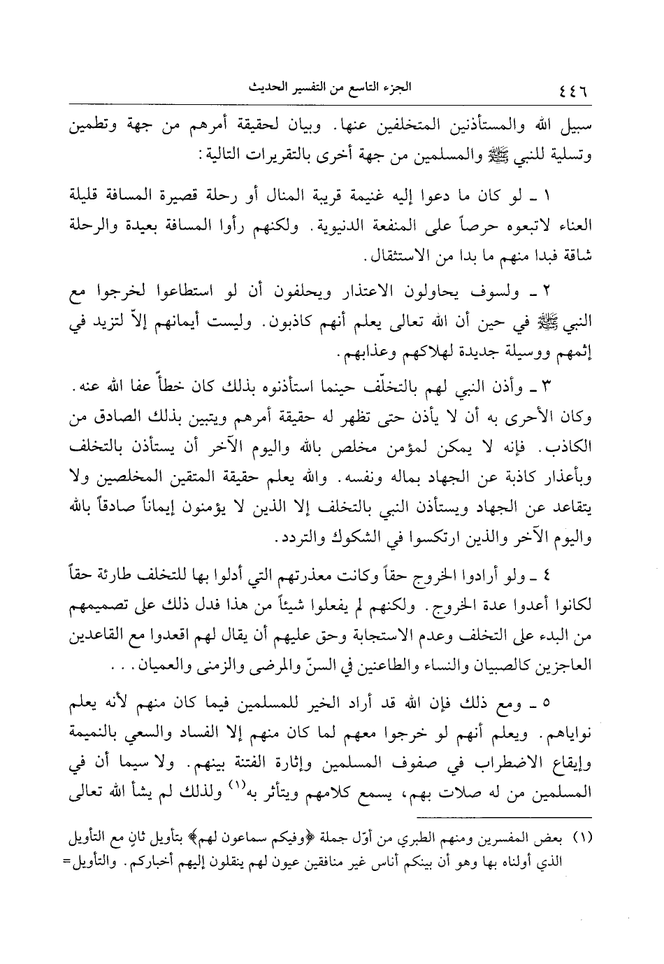 4- ولو أرادوا الخروج حقا وكانت معذرتهم التي أدلوا بها للتخلف طارئة حقا لكانوا أعدوا عدة الخروج. ولكنهم لم يفعلوا شيئا من هذا فدل ذلك على تصميمهم من البدء على التخلف وعدم الاستجابة وحق عليهم أن يقال لهم اقعدوا مع القاعدين العاجزين كالصبيان والنساء والطاعنين في السنّ والمرضى والزمنى والعميان ...