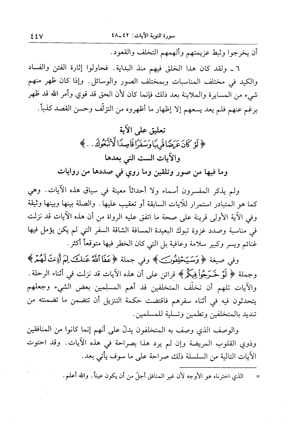 تعليق على الآية لَوْ كانَ عَرَضاً قَرِيباً وَسَفَراً قاصِداً لَاتَّبَعُوكَ.. والآيات الست التي بعدها وما فيها من صور وتلقين وما روي في صددها من روايات