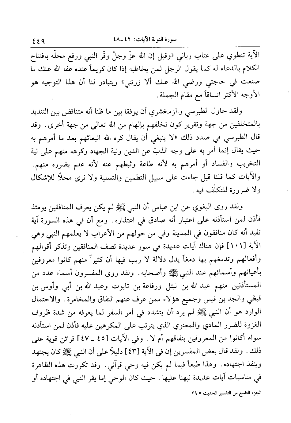 ولقد روى البغوي عن ابن عباس أن النبي صلى الله عليه وسلم لم يكن يعرف المنافقين يومئذ فأذن لمن استأذنه على اعتبار أنه صادق في اعتذاره. ومع أن في هذه السورة آية تفيد أنه كان منافقون في المدينة وفي من حولهم من الأعراب لا يعلمهم النبي وهي الآية [101] فإن هناك آيات عديدة في سور عديدة تصف المنافقين وتذكر أقوالهم وأفعالهم وتدمغهم بها دمغا يدل دلالة لا ريب فيها أن كثيرا منهم كانوا معروفين بأعيانهم وأسمائهم عند النبي صلى الله عليه وسلم وأصحابه. ولقد روى المفسرون أسماء عدد من المستأذنين منهم عبد الله بن نبتل ورفاعة بن تابوت وعبد الله بن أبي وأوس بن قيظي والجد بن قيس وجميع هؤلاء ممن عرف عنهم النفاق والمخامرة. والاحتمال الوارد هو أن النبي صلى الله عليه وسلم لم يرد أن يتشدد في أمر السفر لما يعرفه من شدة ظروف الغزوة للضرر المادي والمعنوي الذي يترتب على المكرهين عليه فأذن لمن استأذنه سواء أكانوا من المعروفين بنفاقهم أم لا. وفي الآيات [45- 47] قرائن قوية على ذلك. ولقد قال بعض المفسرين إن في الآية [43] دليلا على أن النبي صلى الله عليه وسلم كان يجتهد وينفذ اجتهاده. وهذا طبعا فيما لم يكن فيه وحي قرآني. وقد تكررت هذه الظاهرة في مناسبات آيات عديدة نبهنا عليها. حيث كان الوحي إما يقر النبي في اجتهاده أو