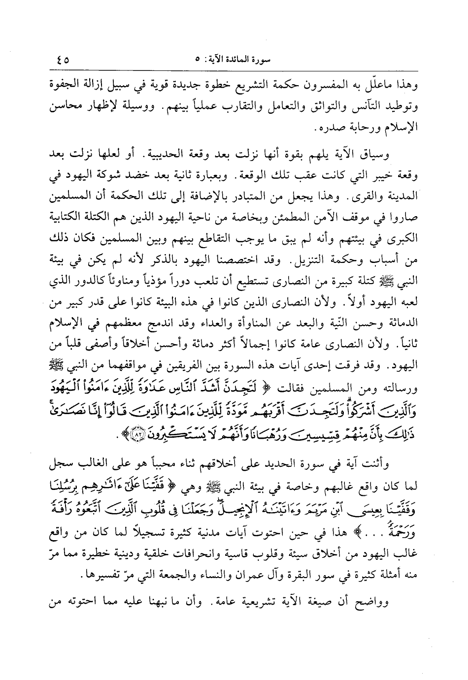 وسياق الآية يلهم بقوة أنها نزلت بعد وقعة الحديبية. أو لعلها نزلت بعد وقعة خيبر التي كانت عقب تلك الوقعة. وبعبارة ثانية بعد خضد شوكة اليهود في المدينة والقرى. وهذا يجعل من المتبادر بالإضافة إلى تلك الحكمة أن المسلمين صاروا في موقف الآمن المطمئن وبخاصة من ناحية اليهود الذين هم الكتلة الكتابية الكبرى في بيئتهم وأنه لم يبق ما يوجب التقاطع بينهم وبين المسلمين فكان ذلك من أسباب وحكمة التنزيل. وقد اختصصنا اليهود بالذكر لأنه لم يكن في بيئة النبي صلى الله عليه وسلم كتلة كبيرة من النصارى تستطيع أن تلعب دورا مؤذيا ومناوئا كالدور الذي لعبه اليهود أولا. ولأن النصارى الذين كانوا في هذه البيئة كانوا على قدر كبير من الدمائة وحسن النّية والبعد عن المناوأة والعداء وقد اندمج معظمهم في الإسلام ثانيا. ولأن النصارى عامة كانوا إجمالا أكثر دماثة وأحسن أخلاقا وأصفى قلبا من اليهود. وقد فرقت إحدى آيات هذه السورة بين الفريقين في مواقفهما من النبي صلى الله عليه وسلم ورسالته ومن المسلمين فقالت لَتَجِدَنَّ أَشَدَّ النَّاسِ عَداوَةً لِلَّذِينَ آمَنُوا الْيَهُودَ وَالَّذِينَ أَشْرَكُوا وَلَتَجِدَنَّ أَقْرَبَهُمْ مَوَدَّةً لِلَّذِينَ آمَنُوا الَّذِينَ قالُوا إِنَّا نَصارى ذلِكَ بِأَنَّ مِنْهُمْ قِسِّيسِينَ وَرُهْباناً وَأَنَّهُمْ لا يَسْتَكْبِرُونَ (82) .