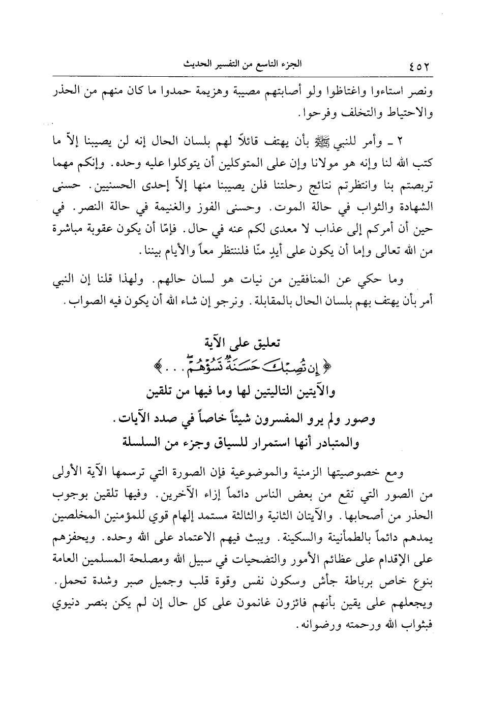 تعليق على الآية إِنْ تُصِبْكَ حَسَنَةٌ تَسُؤْهُمْ ... والآيتين التاليتين لها وما فيها من تلقين وصور ولم يرو المفسرون شيئا خاصا في صدد الآيات. والمتبادر أنها استمرار للسياق وجزء من السلسلة