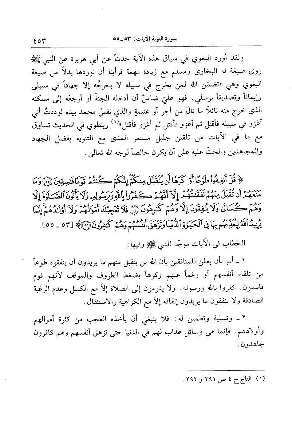 قُلْ أَنْفِقُوا طَوْعاً أَوْ كَرْهاً لَنْ يُتَقَبَّلَ مِنْكُمْ إِنَّكُمْ كُنْتُمْ قَوْماً فاسِقِينَ (53) وَما مَنَعَهُمْ أَنْ تُقْبَلَ مِنْهُمْ نَفَقاتُهُمْ إِلاَّ أَنَّهُمْ كَفَرُوا بِاللَّهِ وَبِرَسُولِهِ وَلا يَأْتُونَ الصَّلاةَ إِلاَّ وَهُمْ كُسالى وَلا يُنْفِقُونَ إِلاَّ وَهُمْ كارِهُونَ (54) فَلا تُعْجِبْكَ أَمْوالُهُمْ وَلا أَوْلادُهُمْ إِنَّما يُرِيدُ اللَّهُ لِيُعَذِّبَهُمْ بِها فِي الْحَياةِ الدُّنْيا وَتَزْهَقَ أَنْفُسُهُمْ وَهُمْ كافِرُونَ (55)
