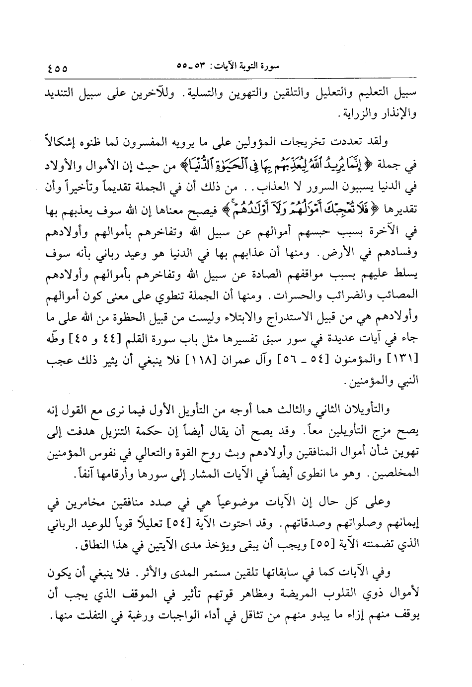 ولقد تعددت تخريجات المؤولين على ما يرويه المفسرون لما ظنوه إشكالا في جملة إِنَّما يُرِيدُ اللَّهُ لِيُعَذِّبَهُمْ بِها فِي الْحَياةِ الدُّنْيا من حيث إن الأموال والأولاد في الدنيا يسببون السرور لا العذاب.. من ذلك أن في الجملة تقديما وتأخيرا وأن تقديرها فَلا تُعْجِبْكَ أَمْوالُهُمْ وَلا أَوْلادُهُمْ فيصبح معناها إن الله سوف يعذبهم بها في الآخرة بسبب حبسهم أموالهم عن سبيل الله وتفاخرهم بأموالهم وأولادهم وفسادهم في الأرض. ومنها أن عذابهم بها في الدنيا هو وعيد رباني بأنه سوف يسلط عليهم بسبب مواقفهم الصادة عن سبيل الله وتفاخرهم بأموالهم وأولادهم المصائب والضرائب والحسرات. ومنها أن الجملة تنطوي على معنى كون أموالهم وأولادهم هي من قبيل الاستدراج والابتلاء وليست من قبيل الحظوة من الله على ما جاء في آيات عديدة في سور سبق تفسيرها مثل باب سورة القلم [44 و 45] وطه [131] والمؤمنون [54- 56] وآل عمران [118] فلا ينبغي أن يثير ذلك عجب النبي والمؤمنين.
