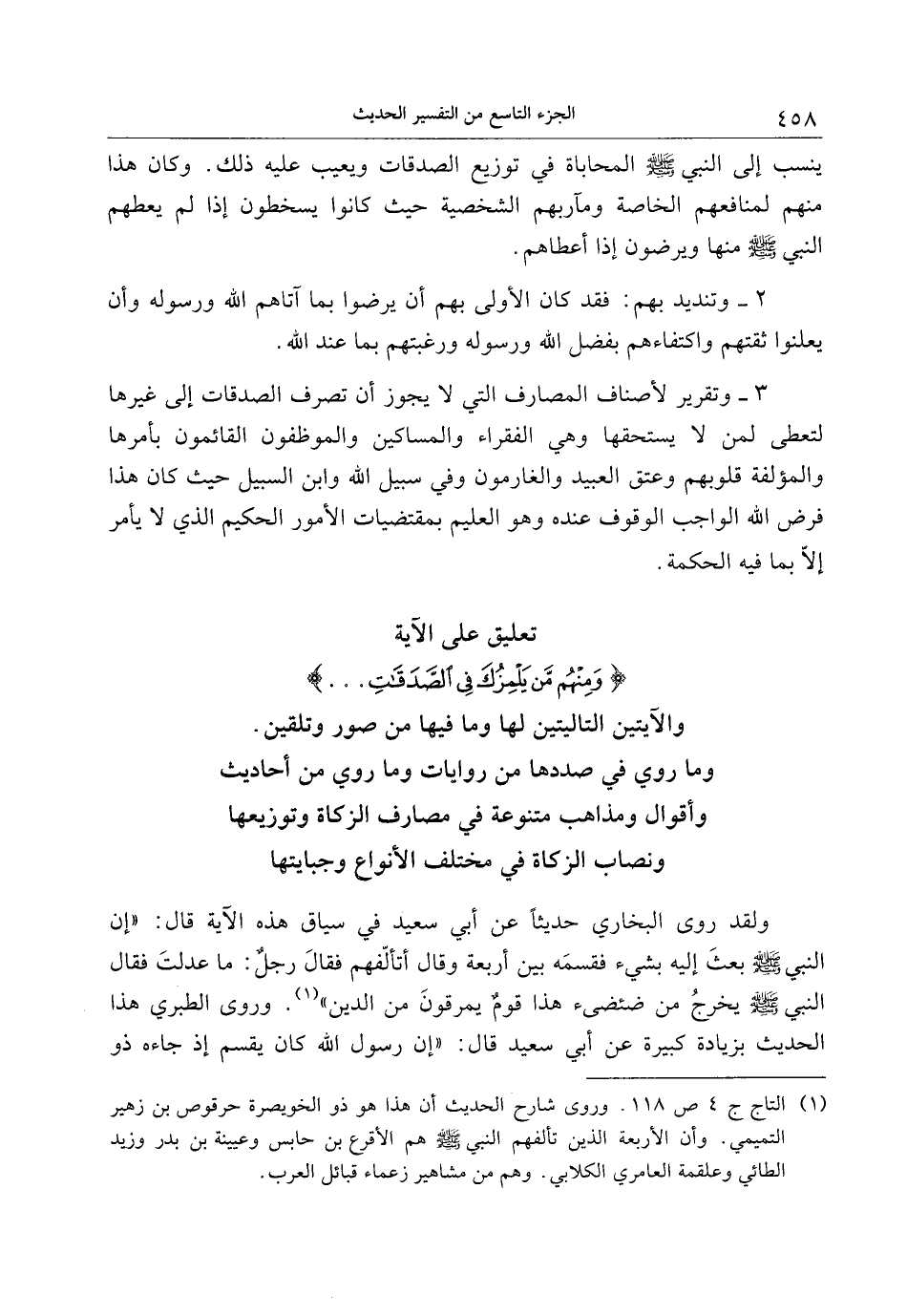 (1) التاج ج 4 ص 118. وروى شارح الحديث أن هذا هو ذو الخويصرة حرقوص بن زهير التميمي. وأن الأربعة الذين تألفهم النبي صلى الله عليه وسلم هم الأقرع بن حابس وعيينة بن بدر وزيد الطائي وعلقمة العامري الكلابي. وهم من مشاهير زعماء قبائل العرب.