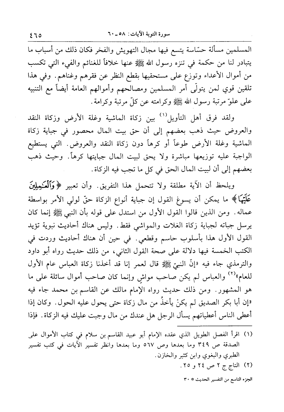 (1) اقرأ الفصل الطويل الذي عقده الإمام أبو عبيد القاسم بن سلام في كتاب الأموال على الصدقة ص 349 وما بعدها وص 567 وما بعدها وانظر تفسير الآيات في كتب تفسير الطبري والبغوي وابن كثير والخازن.