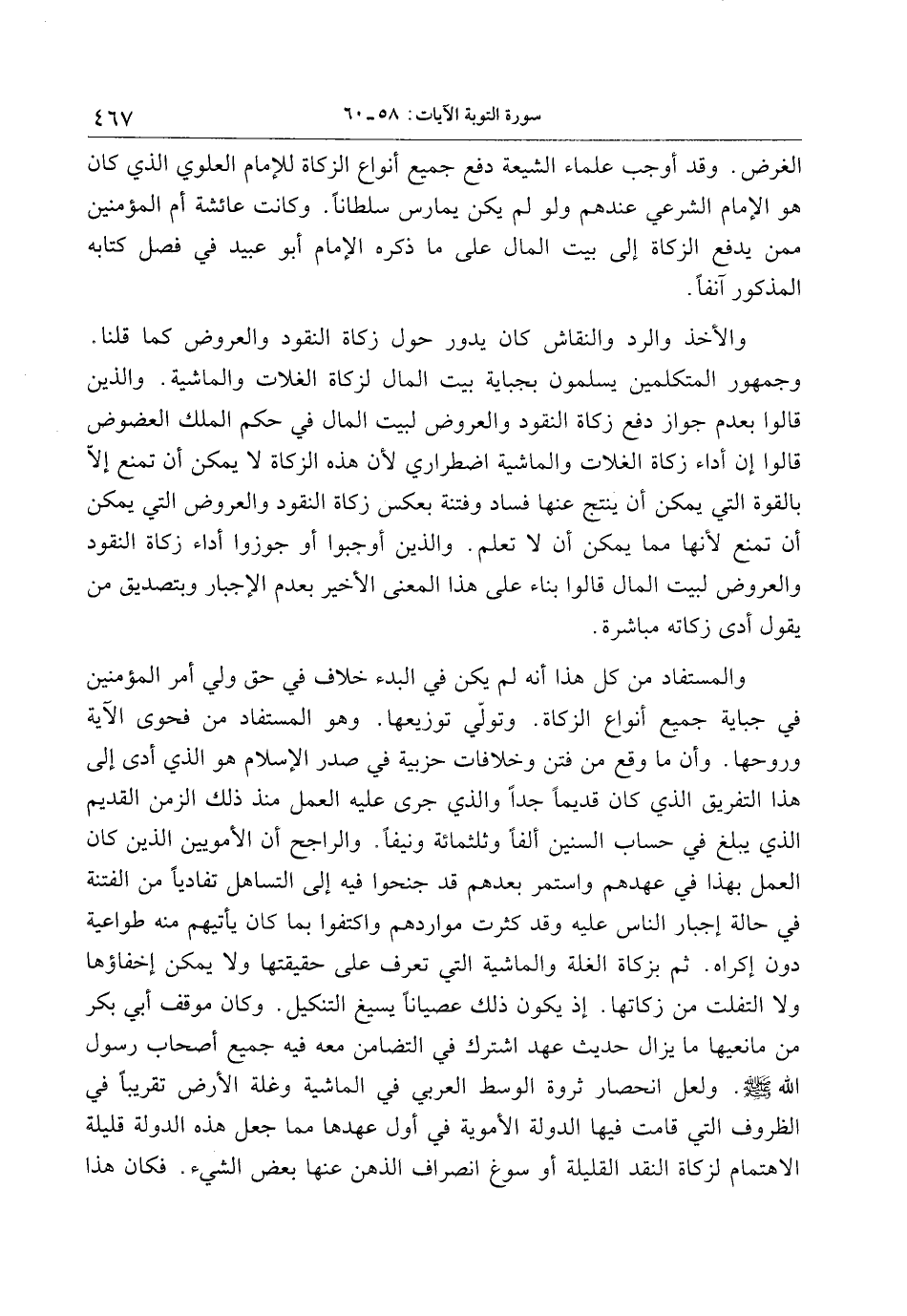 الغرض. وقد أوجب علماء الشيعة دفع جميع أنواع الزكاة للإمام العلوي الذي كان هو الإمام الشرعي عندهم ولو لم يكن يمارس سلطانا. وكانت عائشة أم المؤمنين ممن يدفع الزكاة إلى بيت المال على ما ذكره الإمام أبو عبيد في فصل كتابه المذكور آنفا.