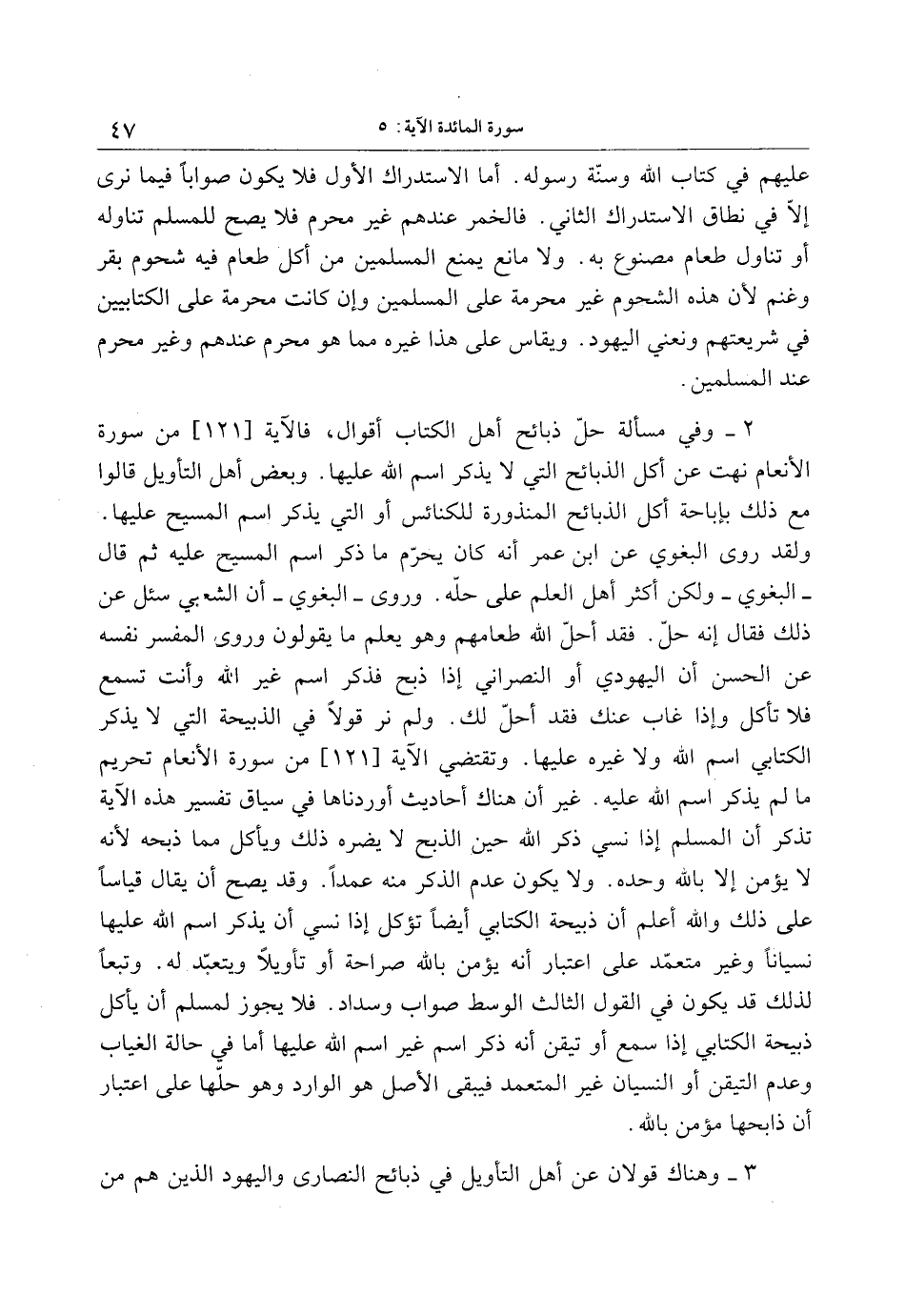 عليهم في كتاب الله وسنّة رسوله. أما الاستدراك الأول فلا يكون صوابا فيما نرى إلّا في نطاق الاستدراك الثاني. فالخمر عندهم غير محرم فلا يصح للمسلم تناوله أو تناول طعام مصنوع به. ولا مانع يمنع المسلمين من أكل طعام فيه شحوم بقر وغنم لأن هذه الشحوم غير محرمة على المسلمين، وإن كانت محرمة على الكتابيين في شريعتهم ونعني اليهود. ويقاس على هذا غيره مما هو محرم عندهم وغير محرم عند المسلمين.