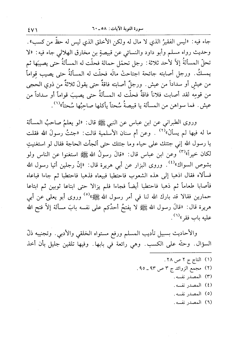 والأحاديث بسبيل تأديب المسلم ورفع مستواه الخلقي والأدبي. وتجنيبه ذلّ السؤال. وحثّه على الكسب. وهي رائعة في بابها. وفيها تلقين جليل بأن أخذ