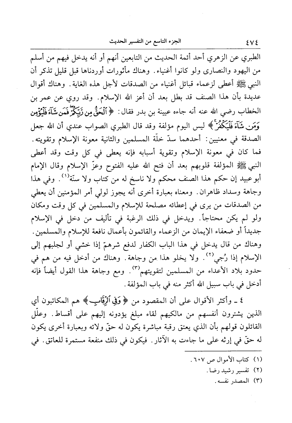 فما كان في معونة الإسلام وتقوية أسبابه فإنه يعطى في كل وقت وقد أعطى النبي صلى الله عليه وسلم المؤلفة قلوبهم بعد أن فتح الله عليه الفتوح وعزّ الإسلام وقال الإمام أبو عبيد إن حكم هذا الصنف محكم ولا ناسخ له من كتاب ولا سنّة «1» . وفي هذا وجاهة وسداد ظاهران. ومعناه بعبارة أخرى أنه يجوز لولي أمر المؤمنين أن يعطي من الصدقات من يرى في إعطائه مصلحة للإسلام والمسلمين في كل وقت ومكان ولو لم يكن محتاجا. ويدخل في ذلك الرغبة في تأليف من دخل في الإسلام جديدا أو ضعفاء الإيمان من الزعماء والقائمون بأعمال نافعة للإسلام والمسلمين.