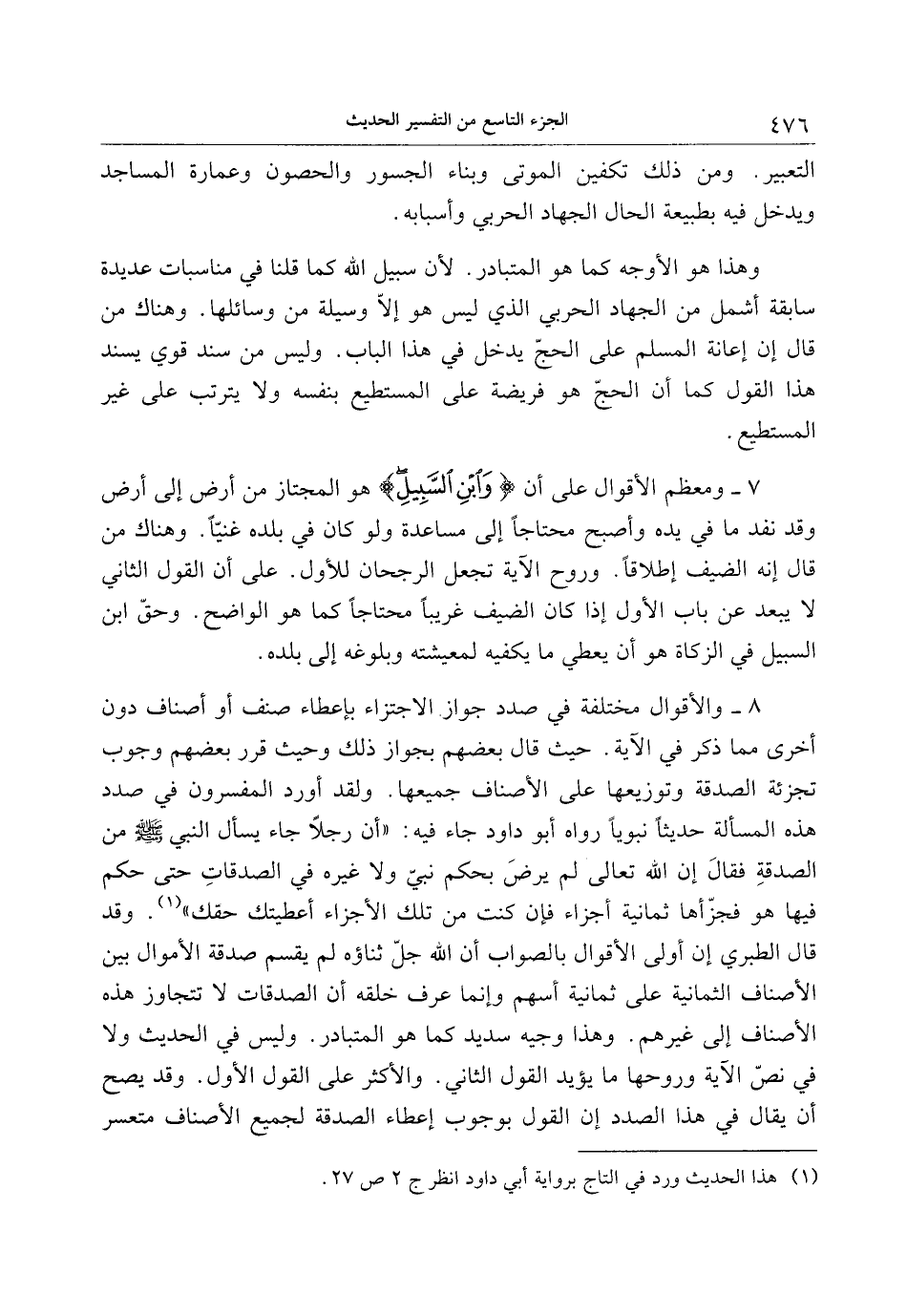 وهذا هو الأوجه كما هو المتبادر. لأن سبيل الله كما قلنا في مناسبات عديدة سابقة أشمل من الجهاد الحربي الذي ليس هو إلّا وسيلة من وسائلها. وهناك من قال إن إعانة المسلم على الحجّ يدخل في هذا الباب. وليس من سند قوي يسند هذا القول كما أن الحجّ هو فريضة على المستطيع بنفسه ولا يترتب على غير المستطيع.
